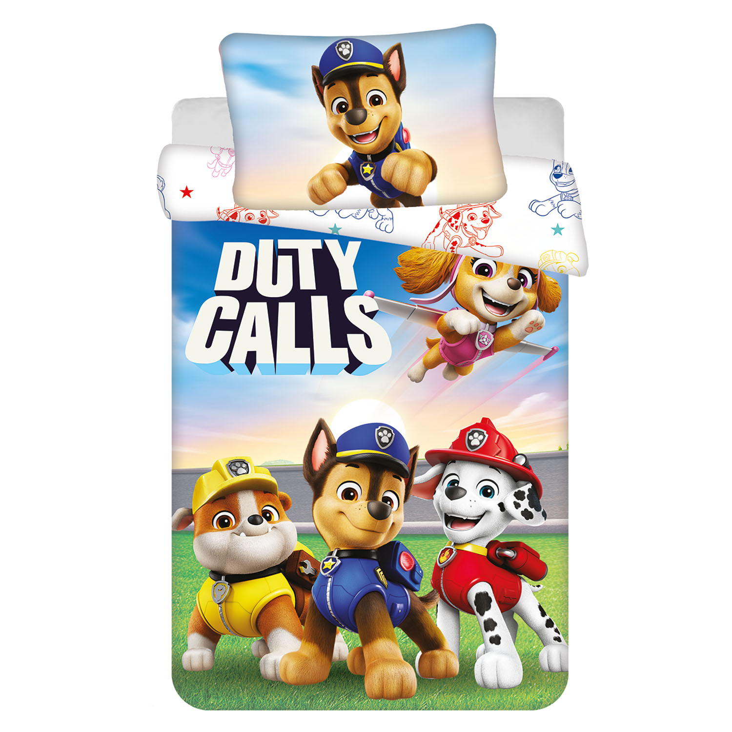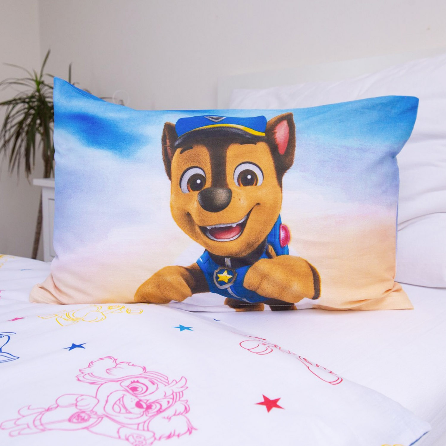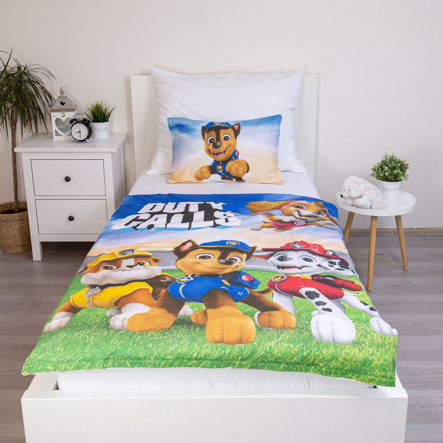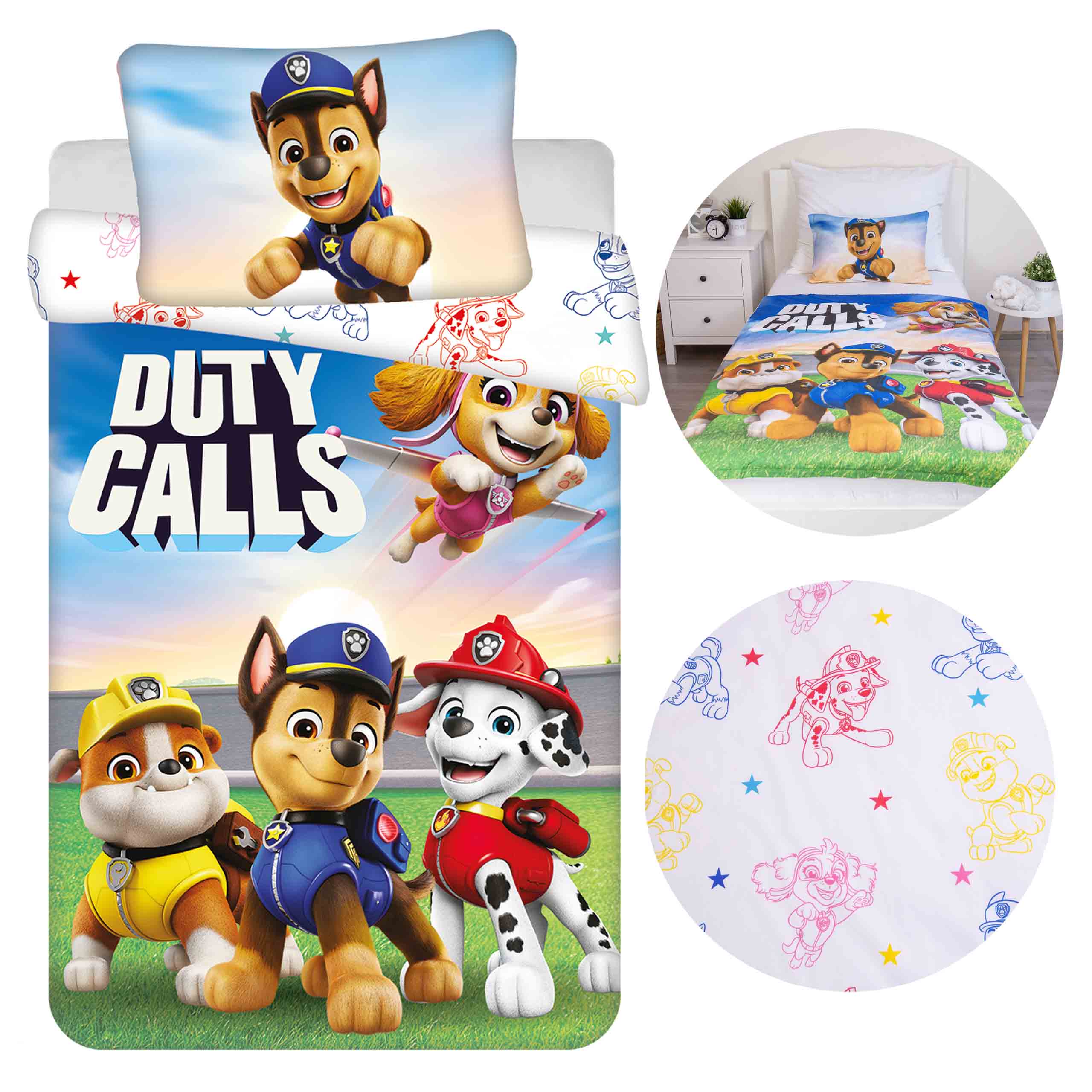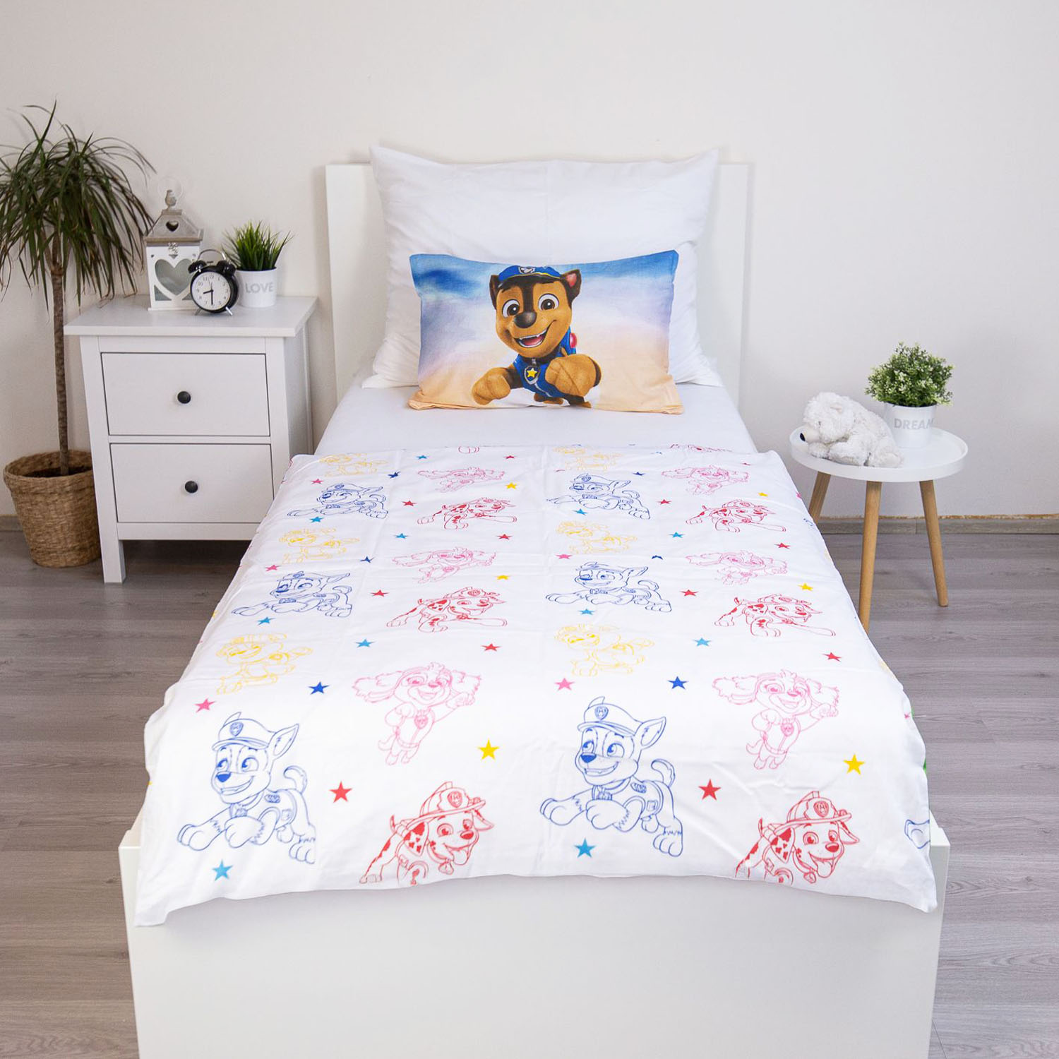 Dwustronny wzór z bohaterami Psi Patrol wprowadza bajkowy klimat do dziecięcego pokoju, tworząc przyjazne i kolorowe otoczenie sprzyjające odpoczynkowi oraz poczuciu bezpieczeństwa.