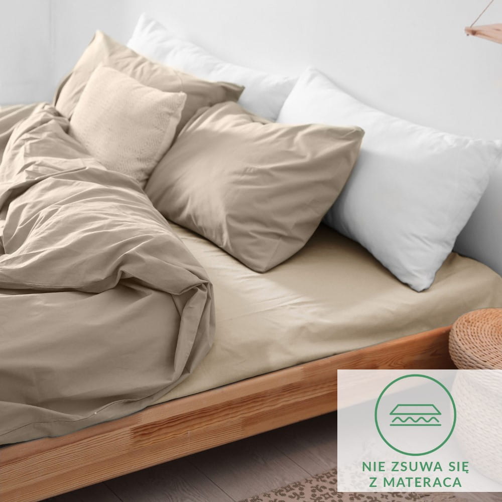 Miękkie i puszyste beżowe prześcieradło 90x200 cm posiada wszytą dookoła wysokiej jakości gumę, która dopasowuje prześcieradło do materaca, dzięki czemu utrzymuje go na swoim miejscu podczas użytkowania i pozwala cieszyć się spokojnym snem. Prześcieradło idealnie pasuje na materac o wysokości do 20 cm.