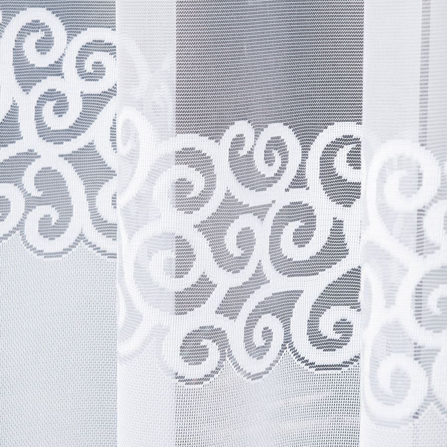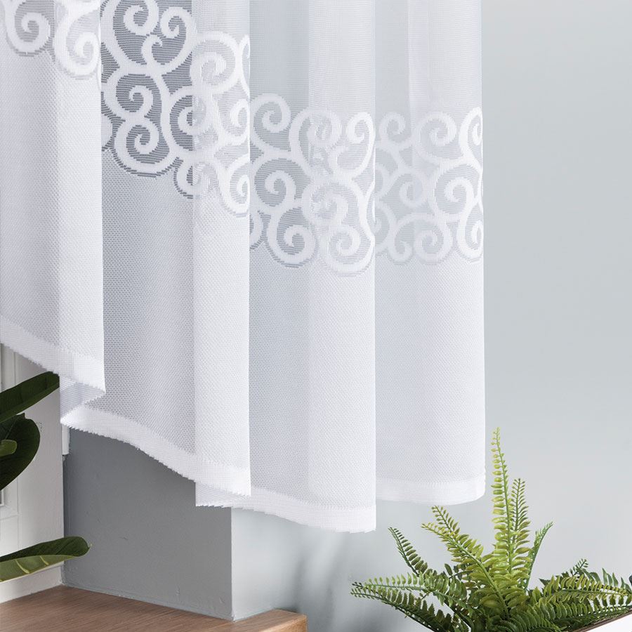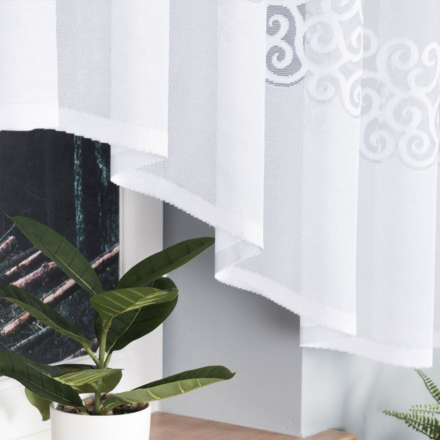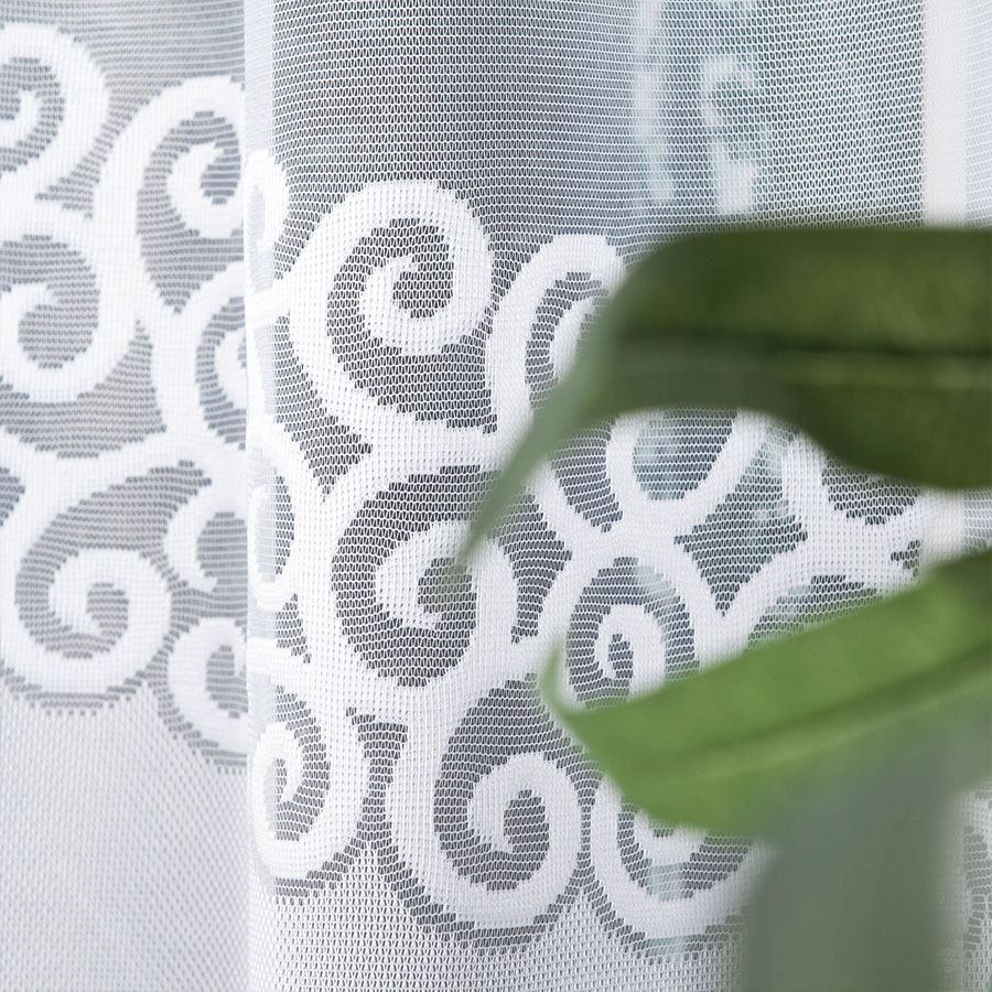 Dekoracyjny żakardowy wzór w dolnej części przyciąga wzrok i nadaje firanie wyrafinowanego charakteru. Faliste, spiralne motywy oraz koronkowa bordiura tworzą efekt delikatnej elegancji, podkreślając estetykę całej aranżacji.