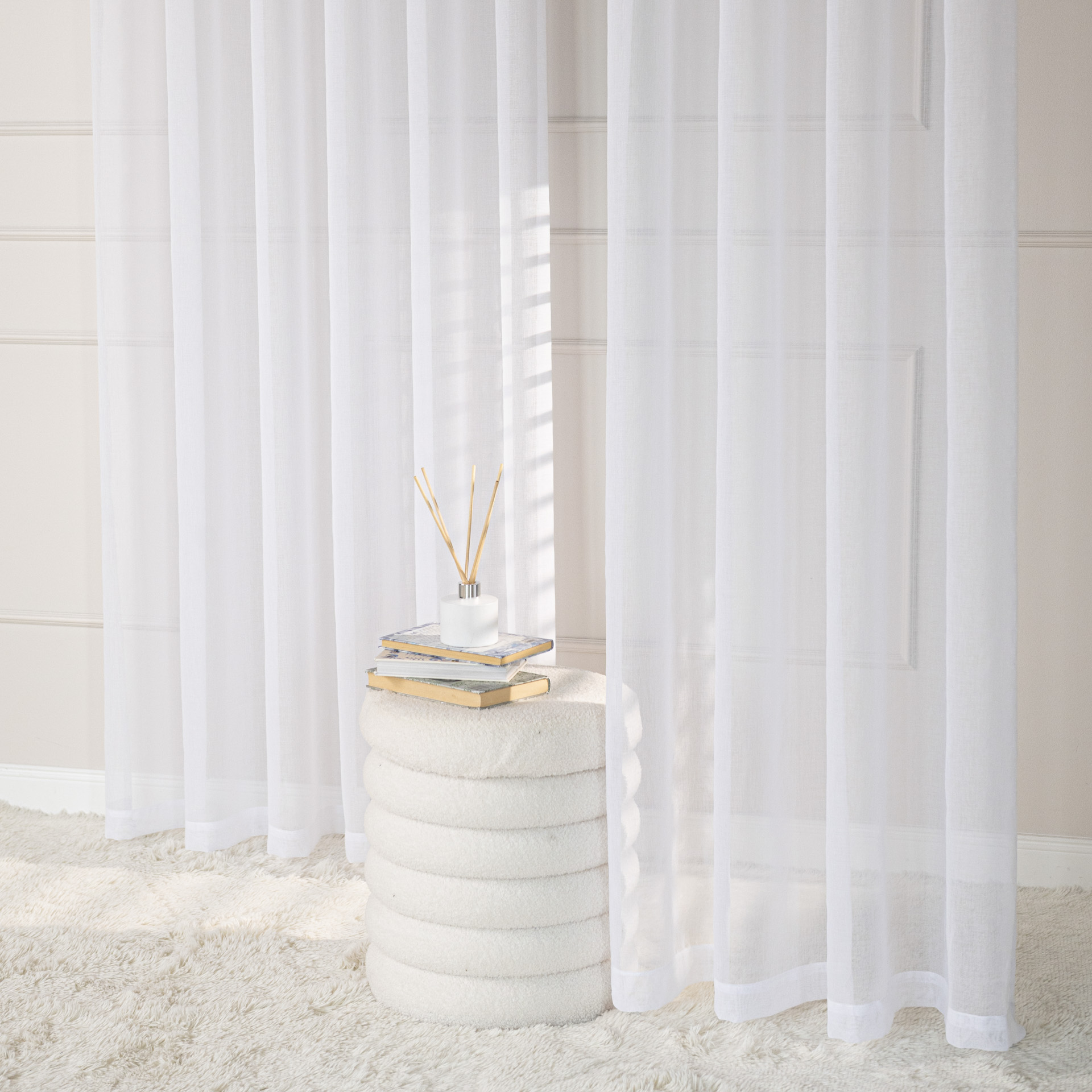 Lekka etamina o gramaturze 80 g/m² delikatnie przepuszcza dużą ilość światła, subtelnie rozjaśniając wnętrze i tworząc przyjemną, jasną atmosferę. Tkanina pięknie się układa i nadaje oknu wizualnej lekkości.