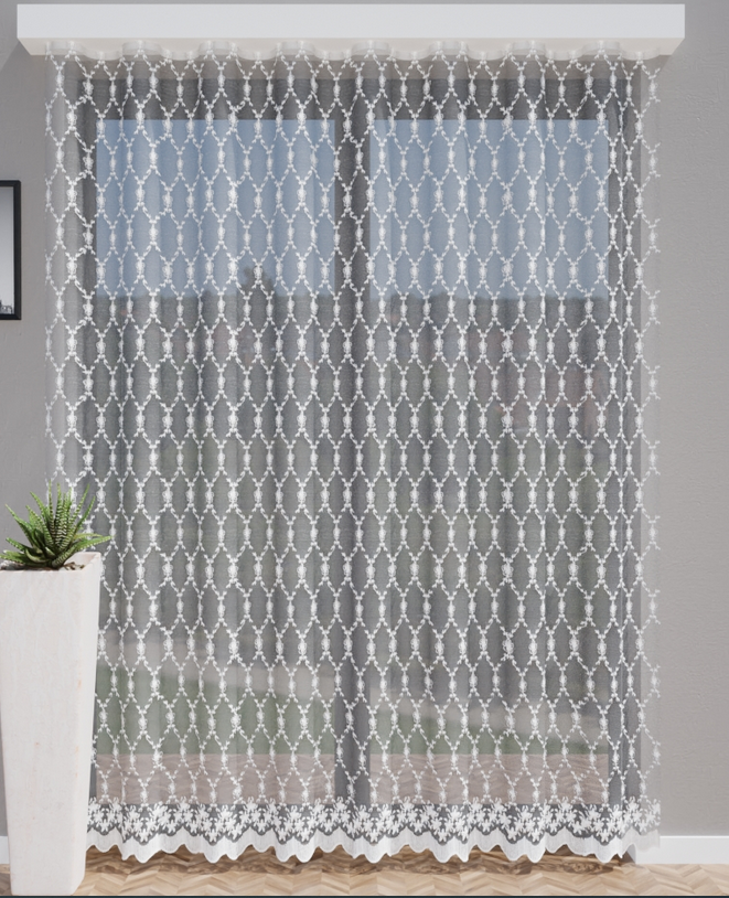 Firana gotowa na etaminie KOKARDKA, na srebrnych przelotkach, haftowana, z ołowianką, 140 x 250, biała ze złotym