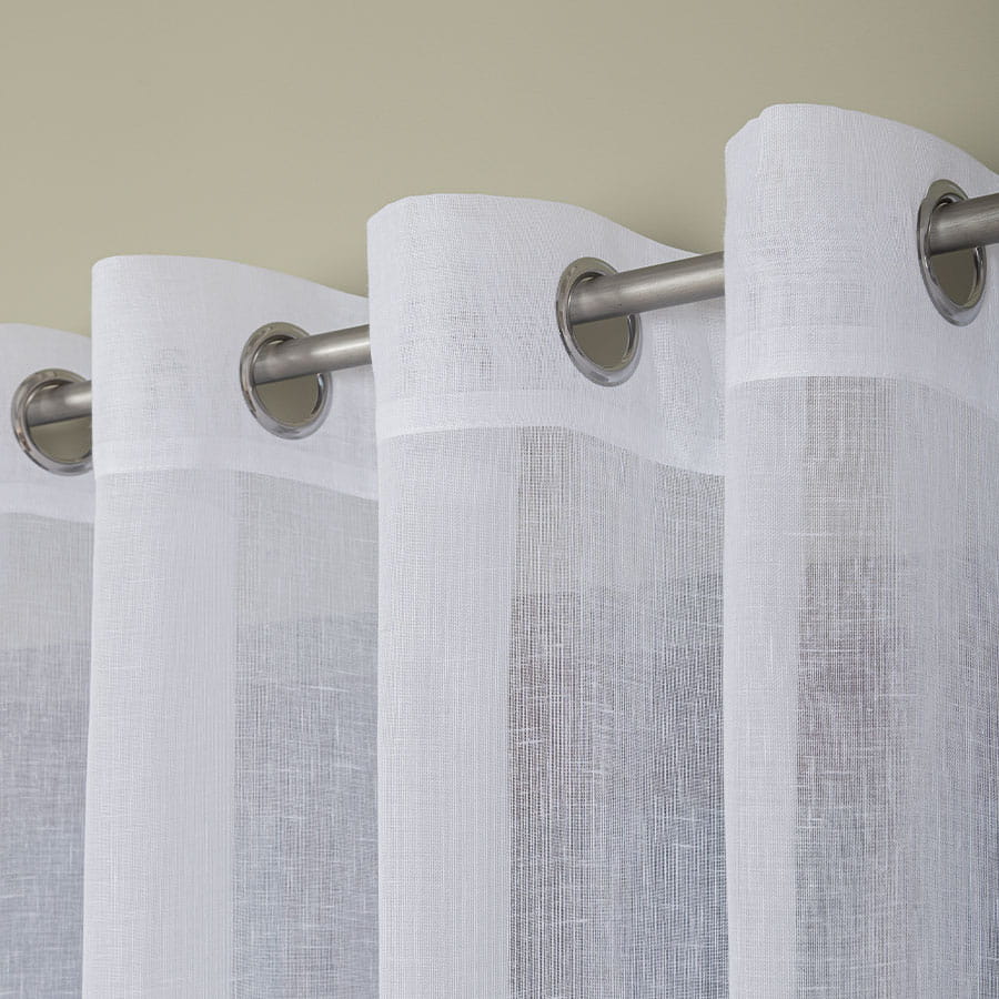Gotowa firanka z białej etaminy na srebrnych przelotkach, subtelnie rozpraszająca światło i dodająca elegancji wnętrzu
