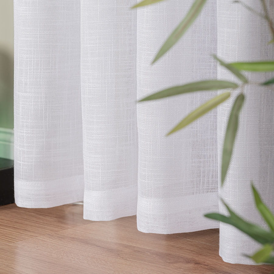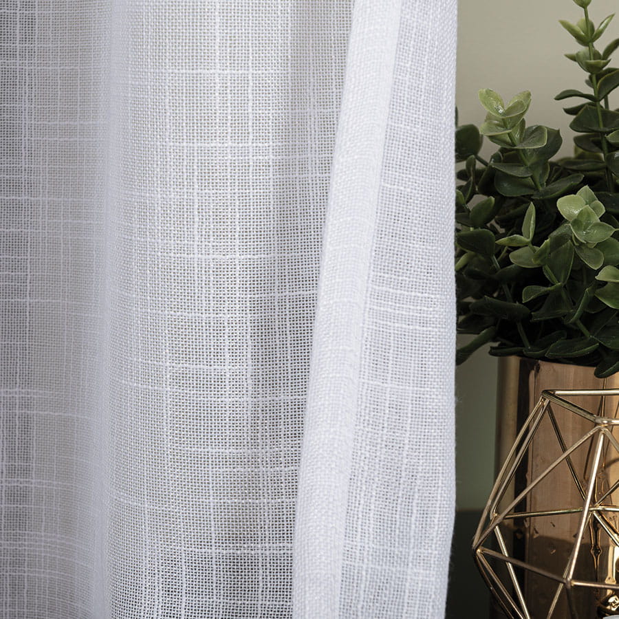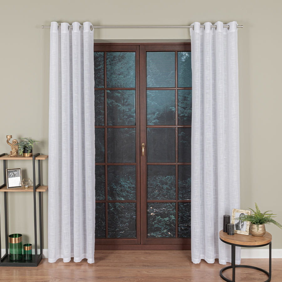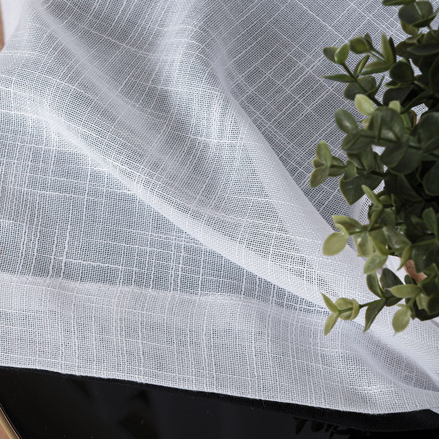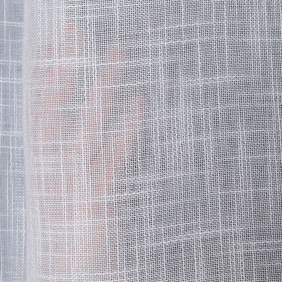 Biała etamina delikatnie filtruje światło, tworząc jasną atmosferę przy zachowaniu prywatności. Tkanina o strukturze przypominającej len dodaje naturalnego, eleganckiego wyglądu, idealnie współgrając z wystrojem wnętrza. Przetkanie nieco grubszymi nitkami nadaje jej niepowtarzalnego charakteru, łącząc estetykę z praktycznością.