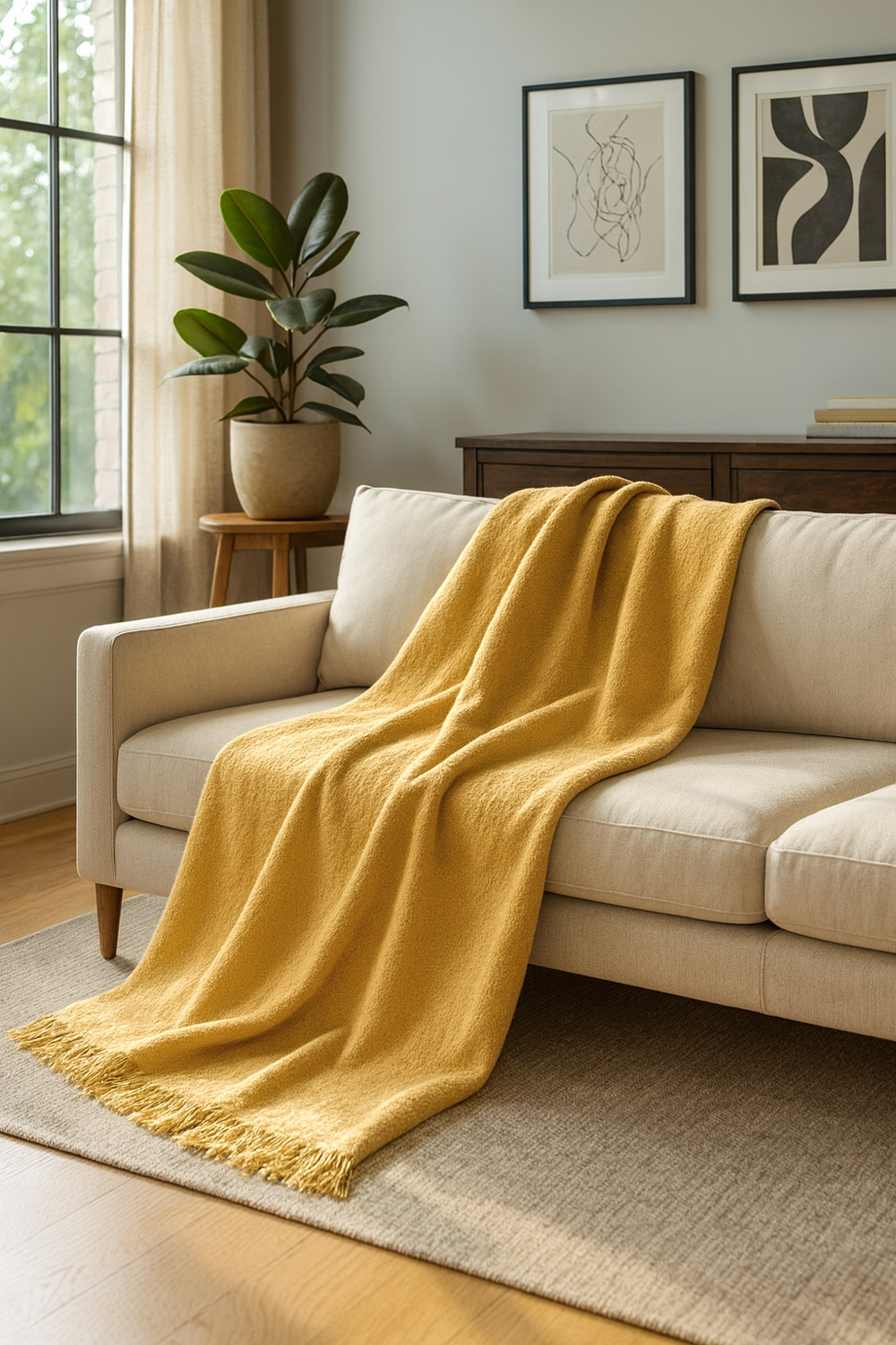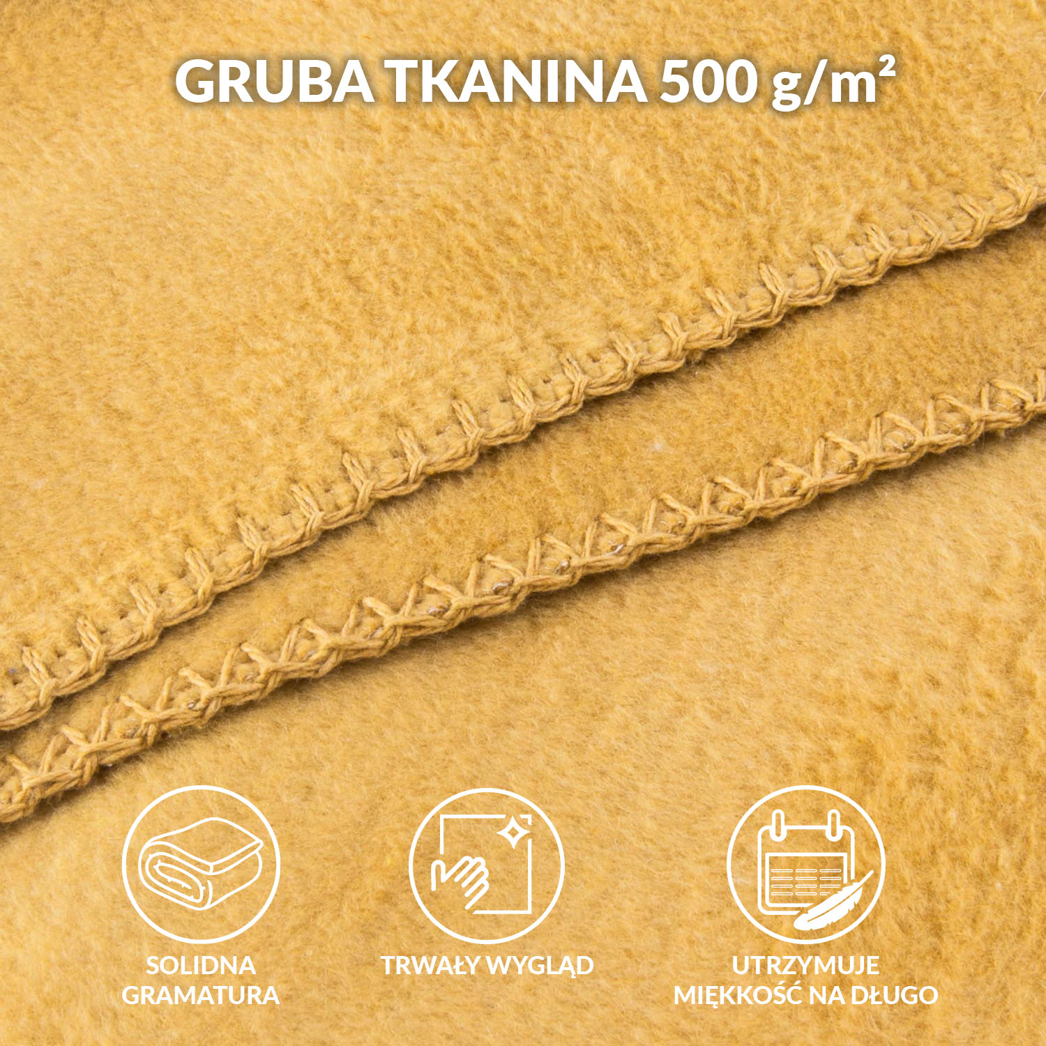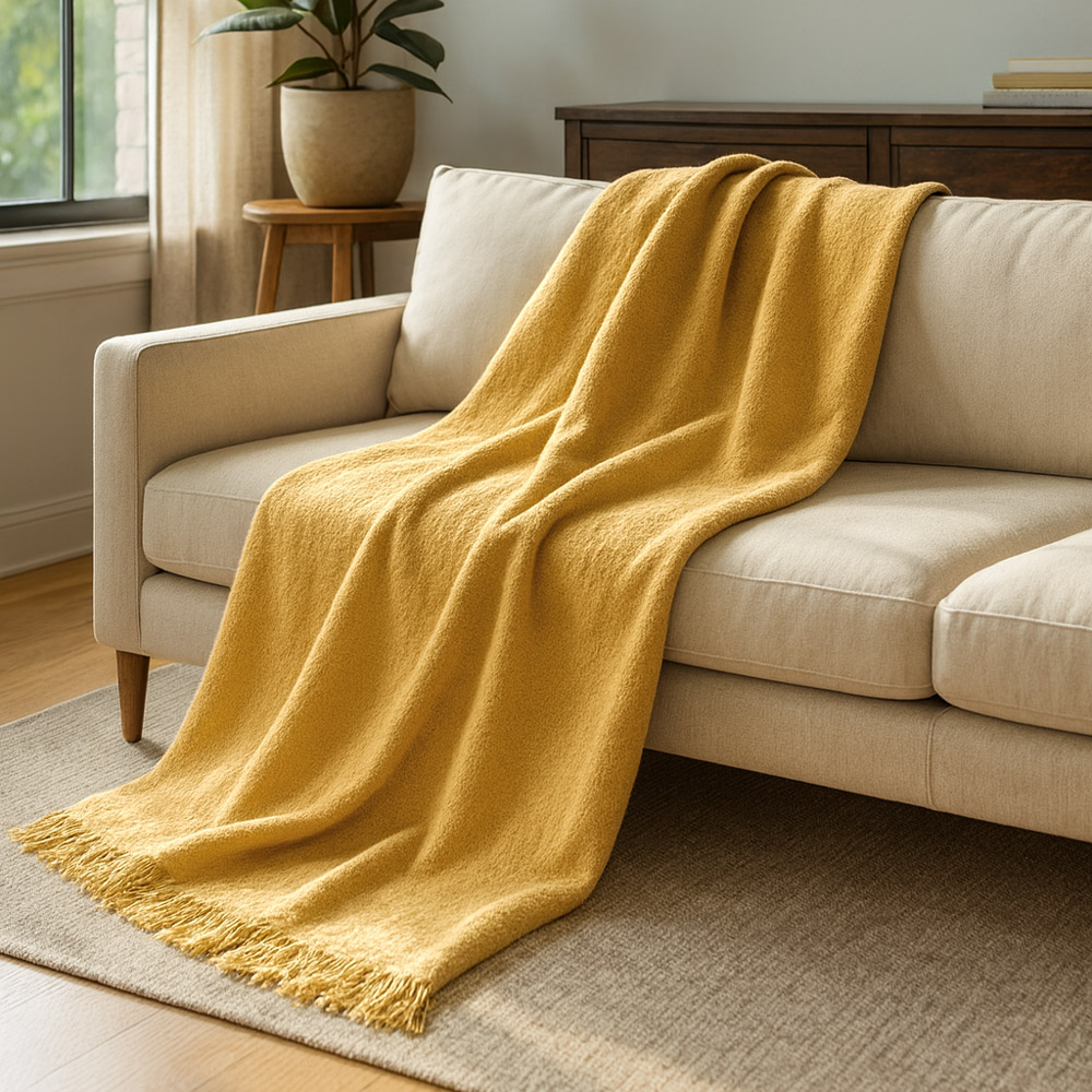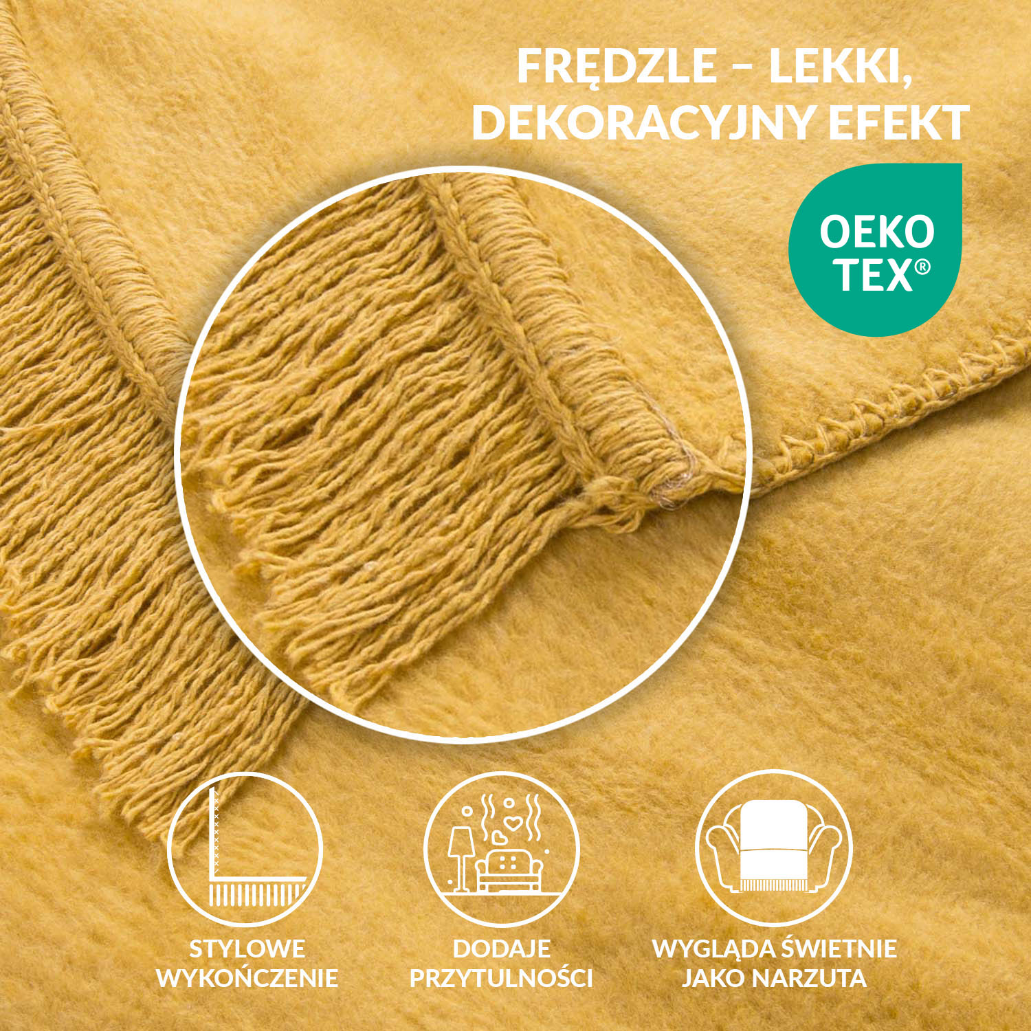 Miękki bardzo ciepły żółty, musztardowy koc bawełniany 200x220 cm z frędzlami