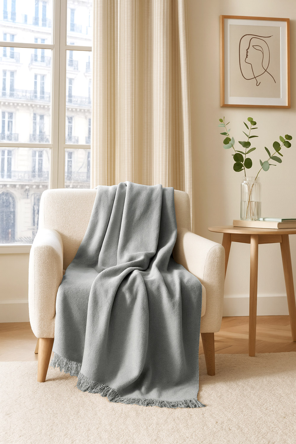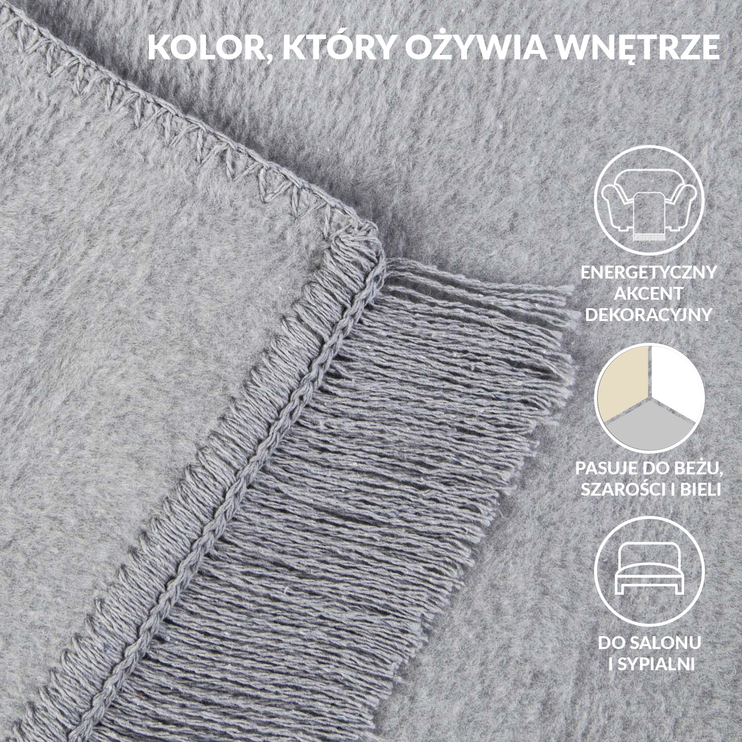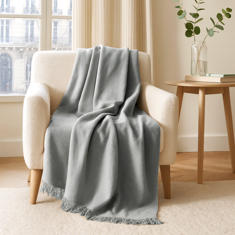 Dwustronne wykończenie sprawia, że koc prezentuje się stylowo z każdej strony. Prosta forma i stonowana barwa czynią go uniwersalnym dodatkiem, który dopełnia aranżację salonu, sypialni lub pokoju gościnnego.