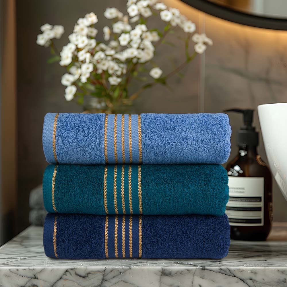 Komplet ręczników z bawełny w eco pudełku kolor ciemny niebieski z bordiurą w złote paski 500 g/m2 TIWANO 2 kpl.