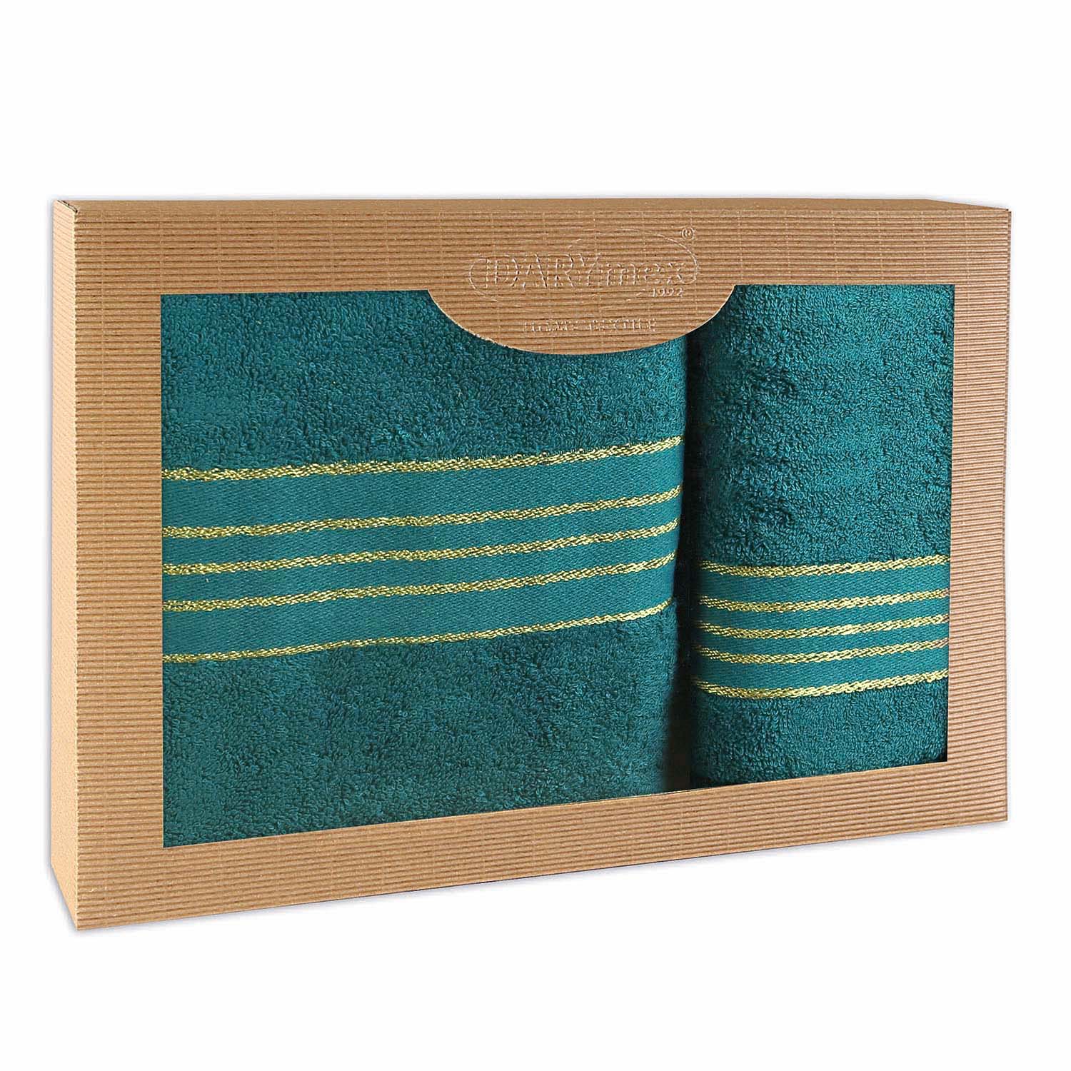 Komplet ciemno turkusowych ręczników zapakowany jest w eleganckie pudełko, co czyni go idealnym pomysłem na prezent.