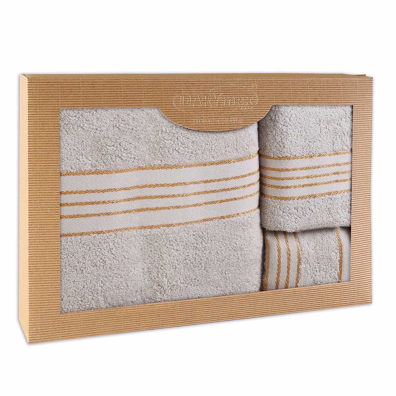 Komplet jasno szarych ręczników zapakowany jest w eleganckie pudełko, co czyni go idealnym pomysłem na prezent.