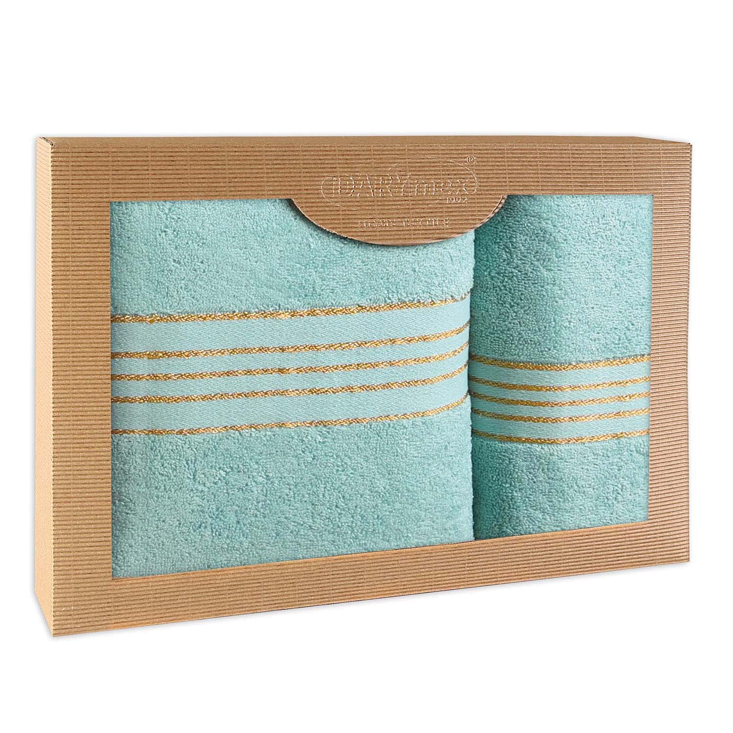 Komplet jasno turkusowych ręczników zapakowany jest w eleganckie pudełko, co czyni go idealnym pomysłem na prezent.