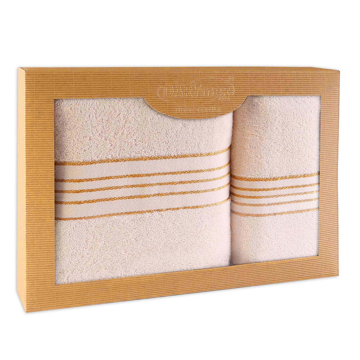 Komplet ręczników z bawełny w eco pudełku kolor kremowy z bordiurą w złote paski 500 g/m2 TIWANO 2 kpl.