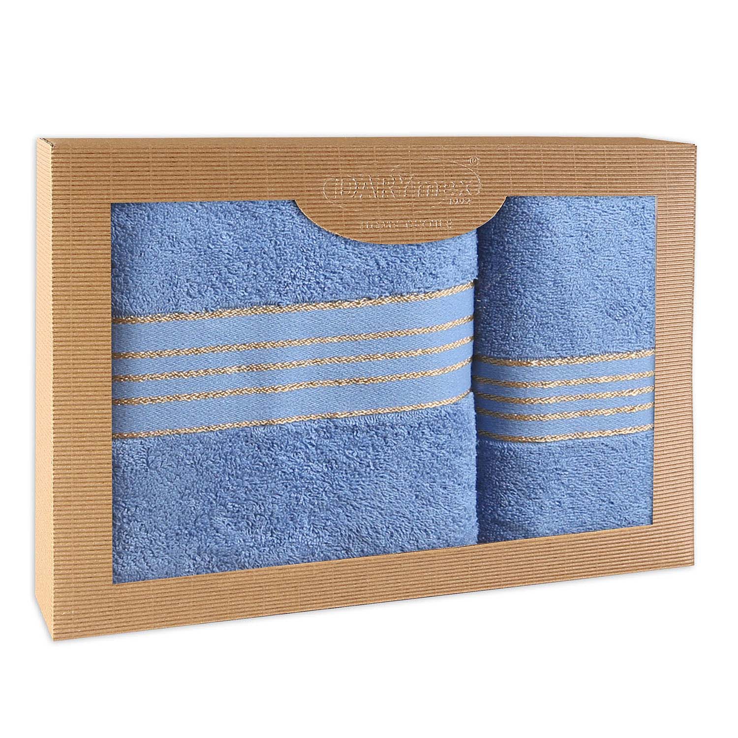 Komplet niebieskich ręczników zapakowany jest w eleganckie pudełko, co czyni go idealnym pomysłem na prezent.
