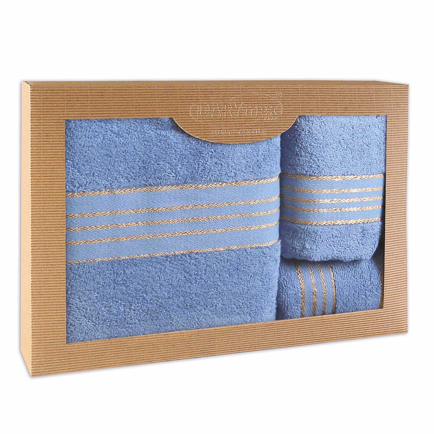 Komplet niebieskich ręczników zapakowany jest w eleganckie pudełko, co czyni go idealnym pomysłem na prezent.