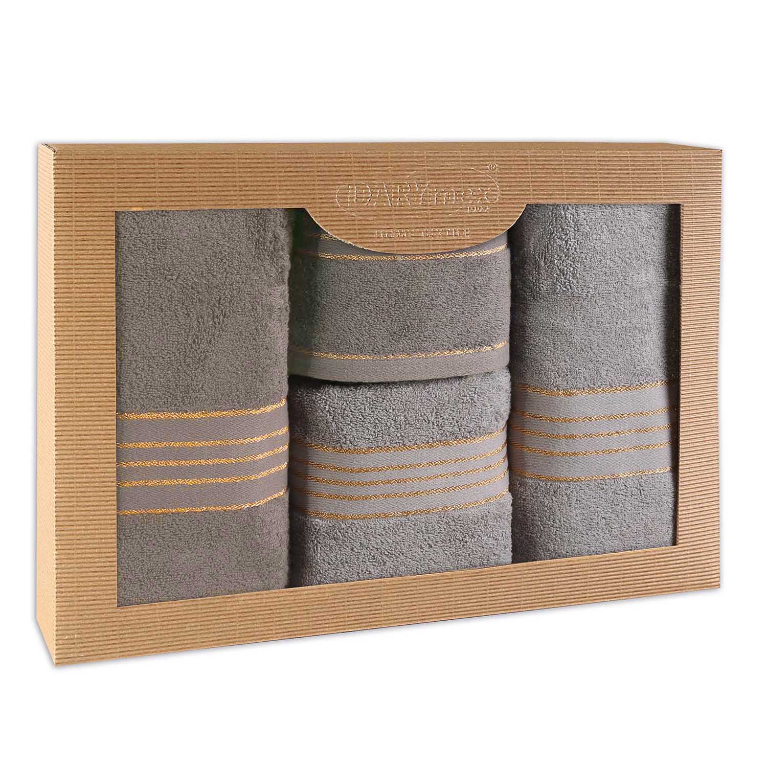 Komplet szarych ręczników zapakowany jest w eleganckie pudełko, co czyni go idealnym pomysłem na prezent.