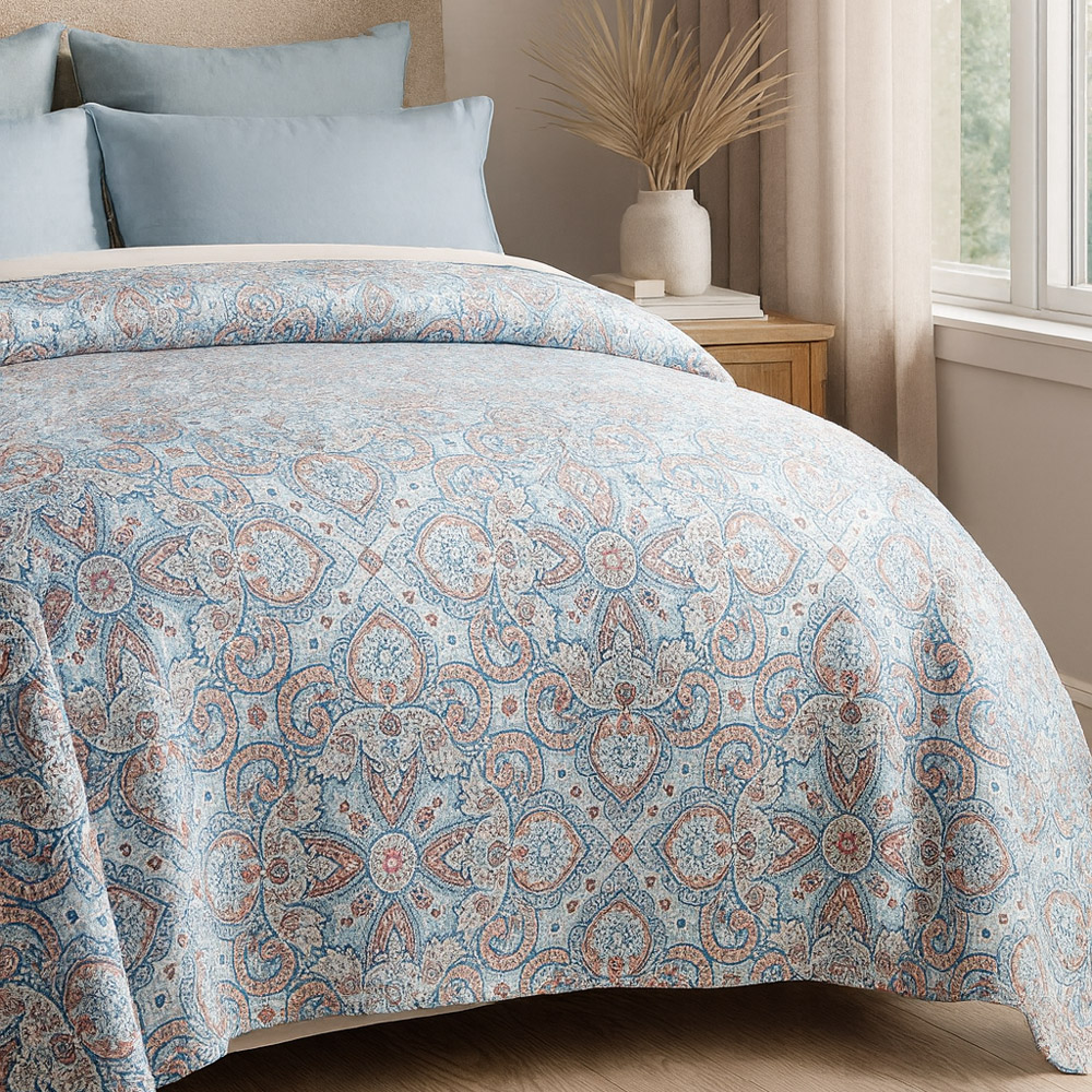 Pikowana, miękka, wzorzysta narzuta drukowana w rozmiarze 170x210 cm w ozdobny kolorowy ornament