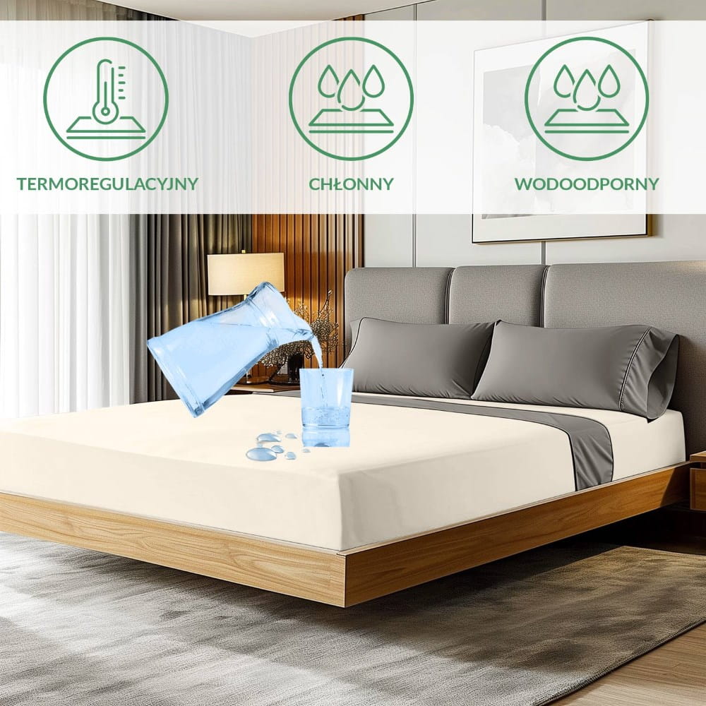 Oddychająca, termoregulacyjna struktura w połączeniu z nieprzemakalnym podkładem PU zapewnia komfort i skuteczną ochronę, odprowadzając wilgoć i jednocześnie zabezpieczając materac.