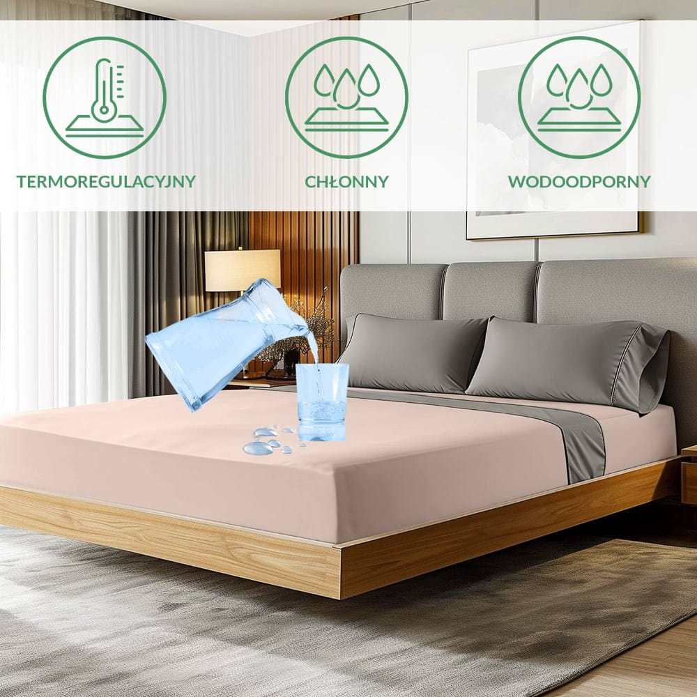 Oddychająca, termoregulacyjna struktura w połączeniu z nieprzemakalnym podkładem PU zapewnia komfort i skuteczną ochronę, odprowadzając wilgoć i jednocześnie zabezpieczając materac.
