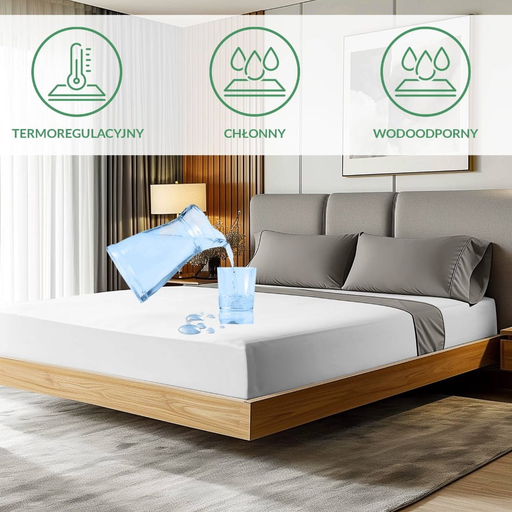 Oddychająca, termoregulacyjna struktura w połączeniu z nieprzemakalnym podkładem PU zapewnia komfort i skuteczną ochronę, odprowadzając wilgoć i jednocześnie zabezpieczając materac.