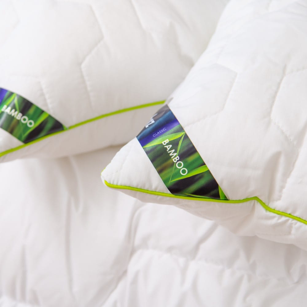 Poszycie: Włókna bambusa są naturalnie antygrzybiczne i bakteriobójcze. Dzięki nim poduszka jest bardzo miękka i delikatna w dotyku, jednocześnie korzystnie wpływają na jej wysoką wytrwałość. Poduszka Bamboo jest oddychająca, dzięki włóknom bambusa, które charakteryzują się licznymi mikroporami. Zapewnia nam to odpowiednie krążenie powietrza na najwyższym poziomie i nie powodując przegrzania organizmu. Tkanina składa się z 50% bawełny i 50% bambusa.