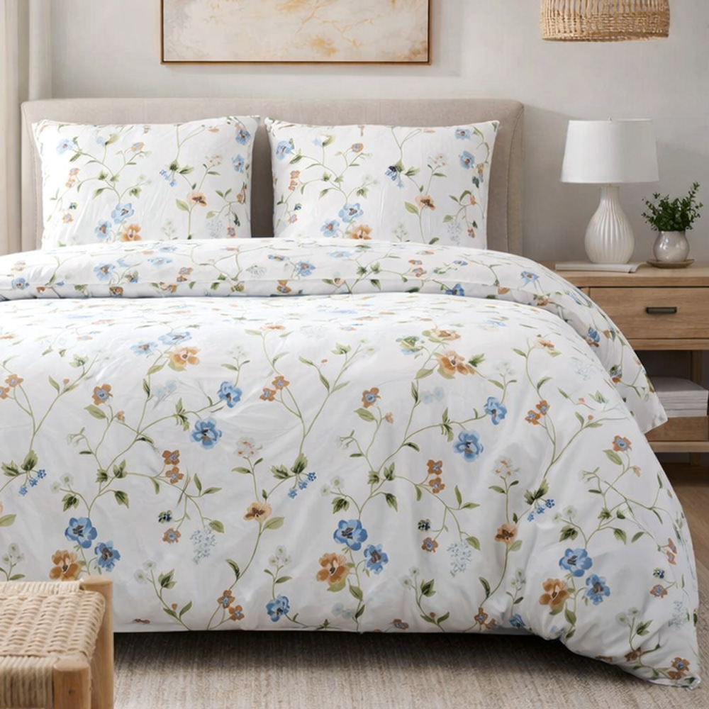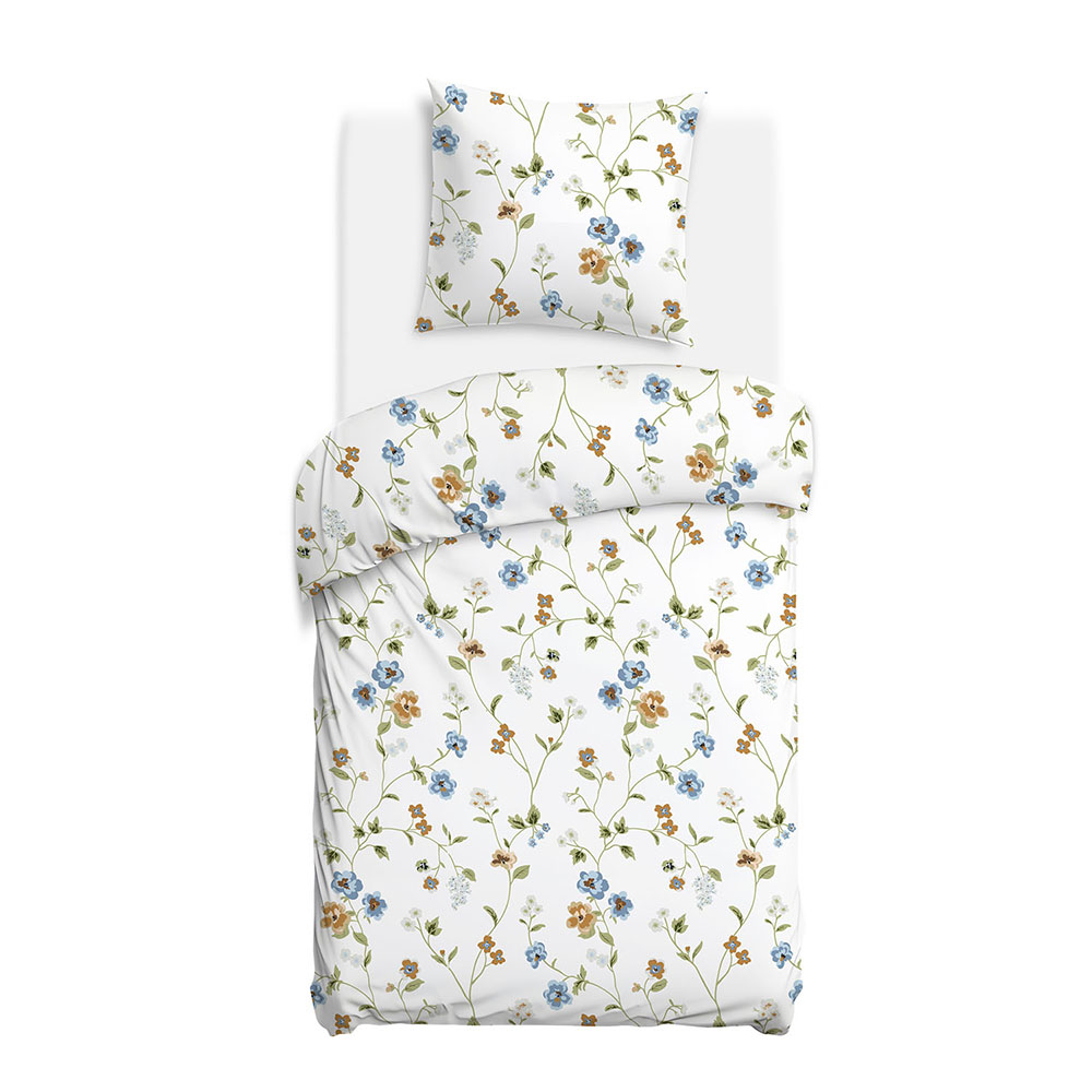 Gęsty, mocny splot materiału sprawia, że pościel zachowuje swoją jakość, a delikatne kwiatowe nadruki pozostają wyraźne nawet po wielu praniach. Można prać w 40°C.