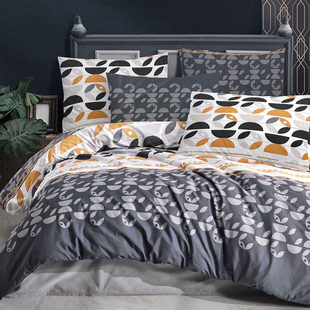 Piękny komplet szarej pościeli 160x200 cm + 2x poszewki na poduszki 70x80 cm w biały i pomarańczowy ornament