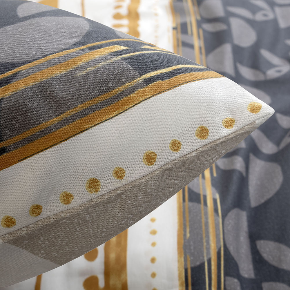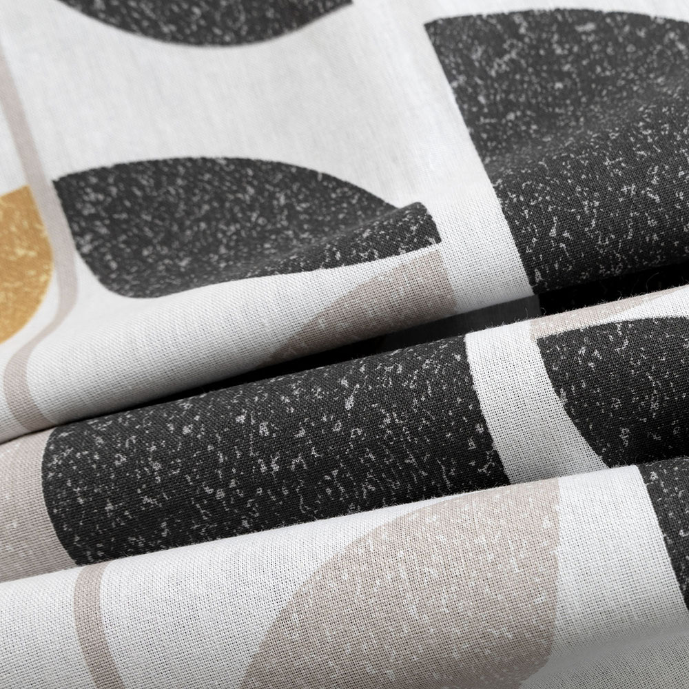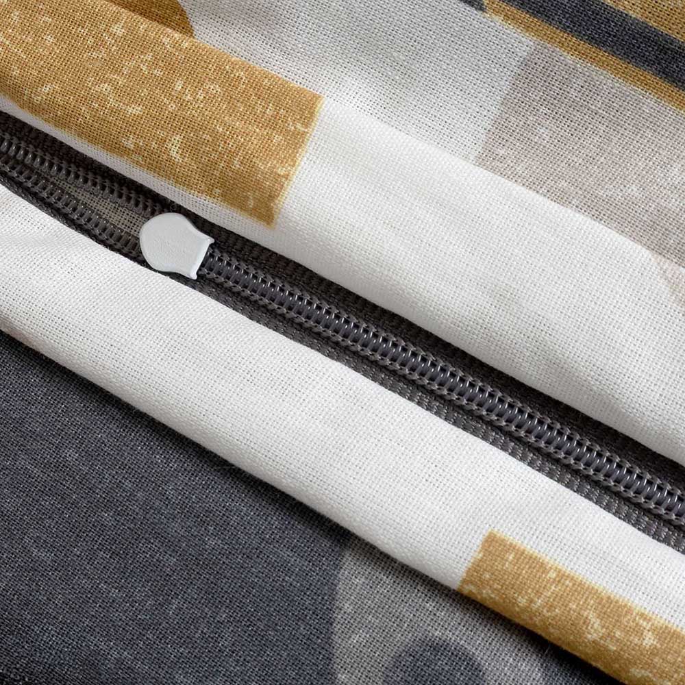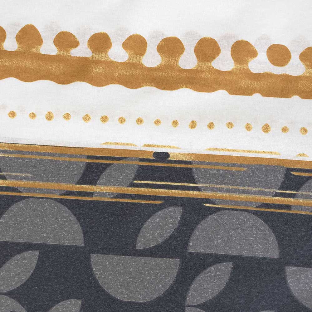 Nowoczesny geometryczny wzór w kontrastowych odcieniach szarości, bieli i musztardy przyciąga uwagę i nadaje wnętrzu designerskiego charakteru. Dynamiczna kompozycja świetnie sprawdzi się w nowoczesnych, odważniejszych aranżacjach, podkreślając indywidualny styl sypialni.