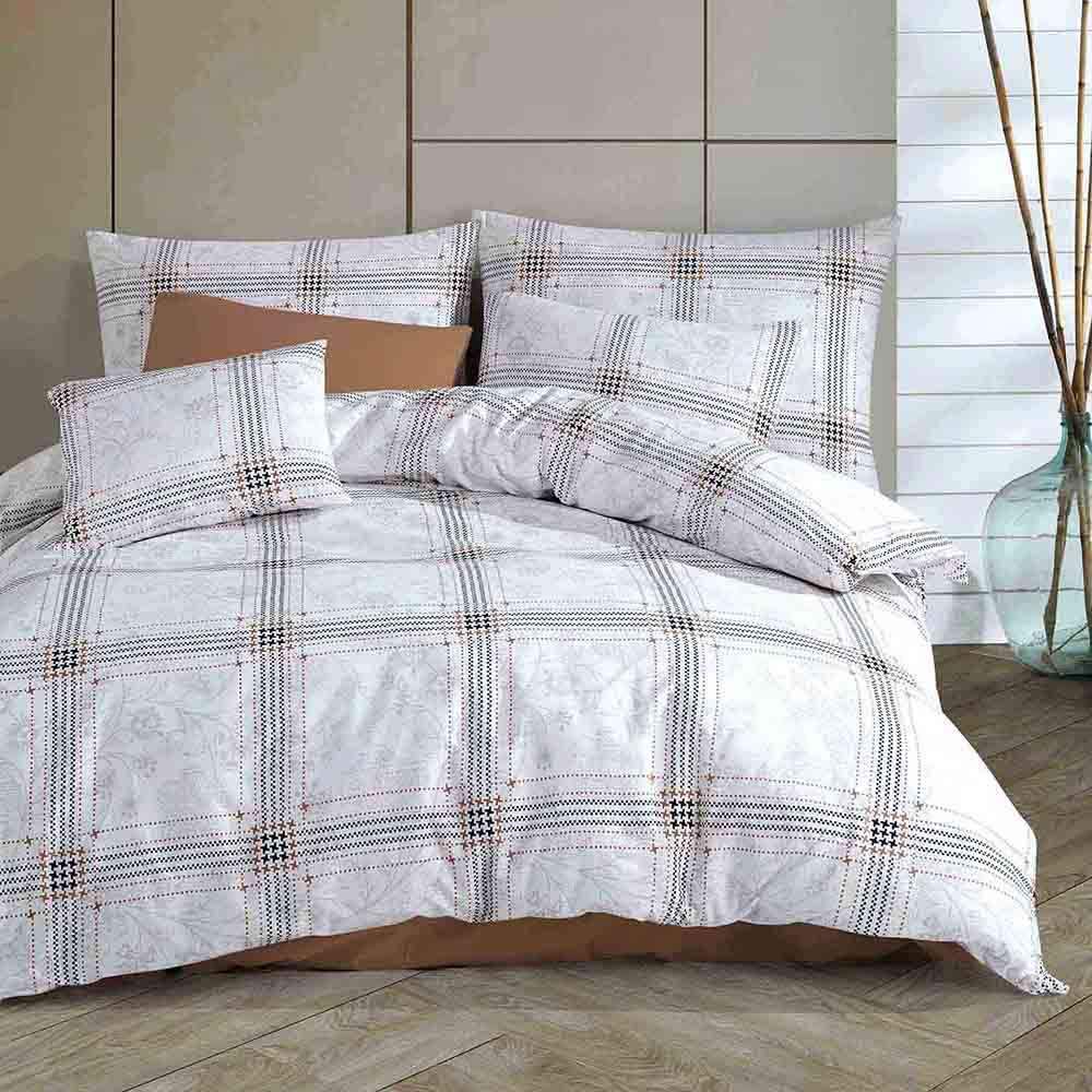 Elegancki komplet białej pościeli 160x200 cm + 2x poszewki na poduszki 70x80 cm w szaro pomarańczową kratkę