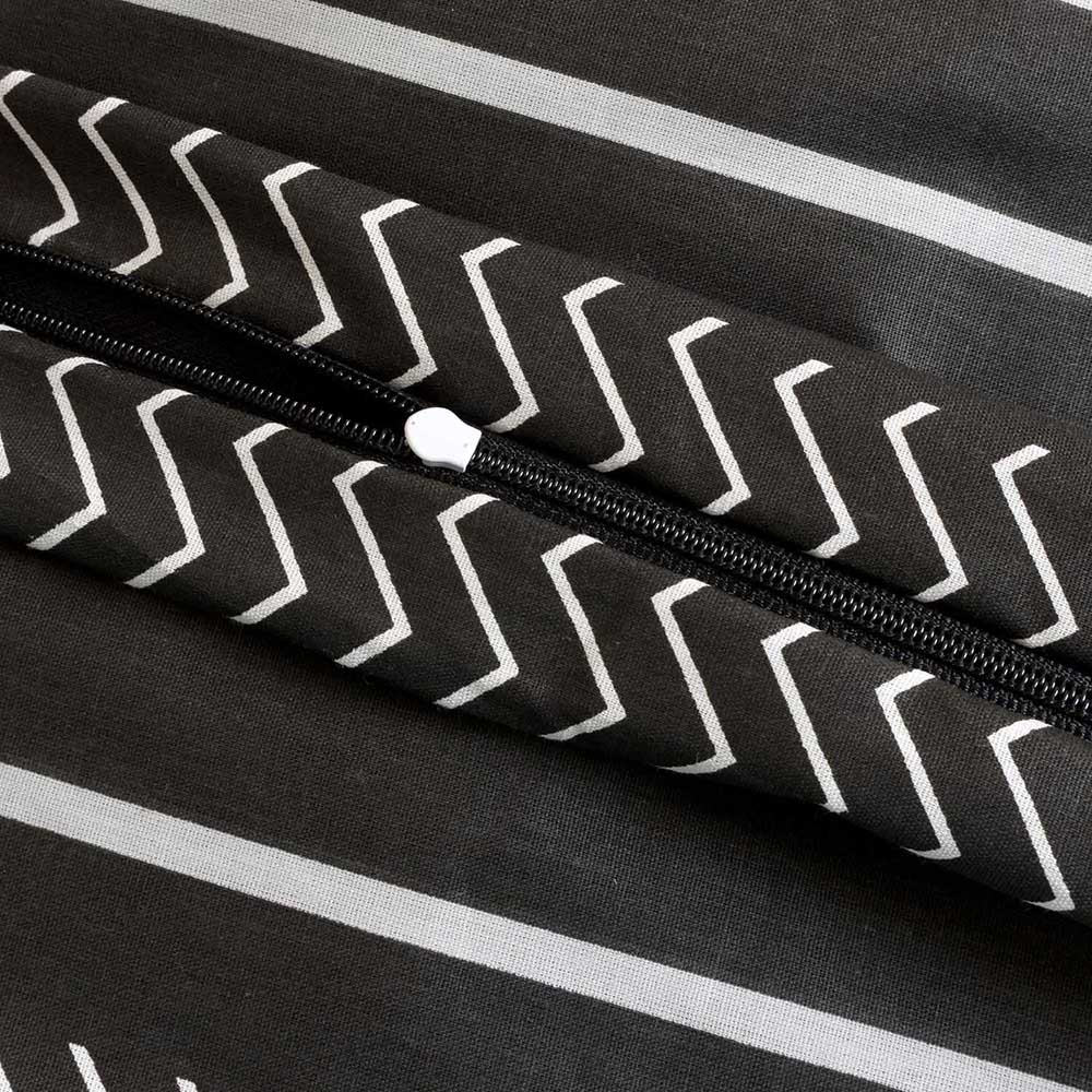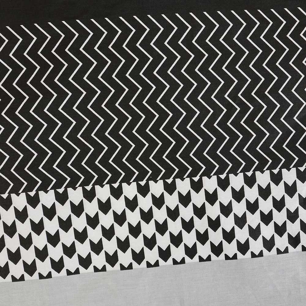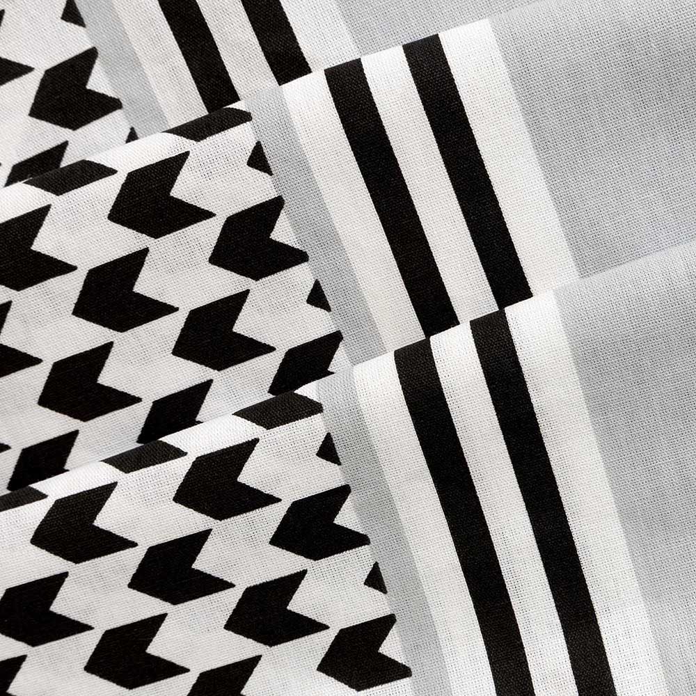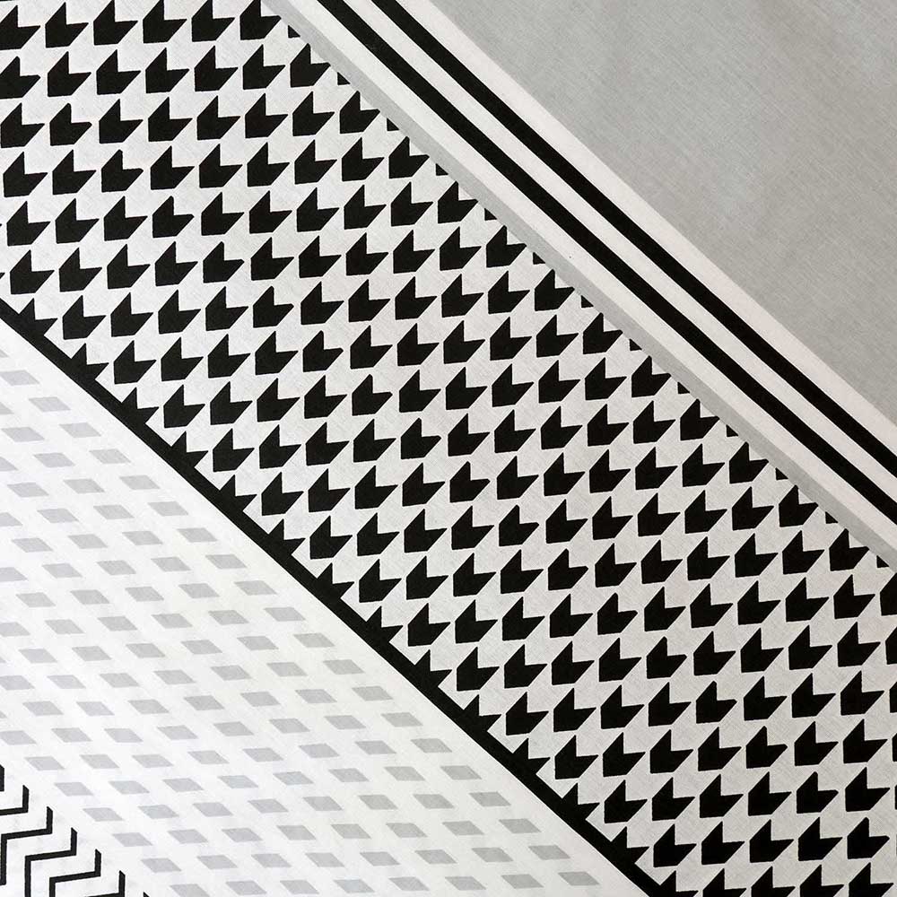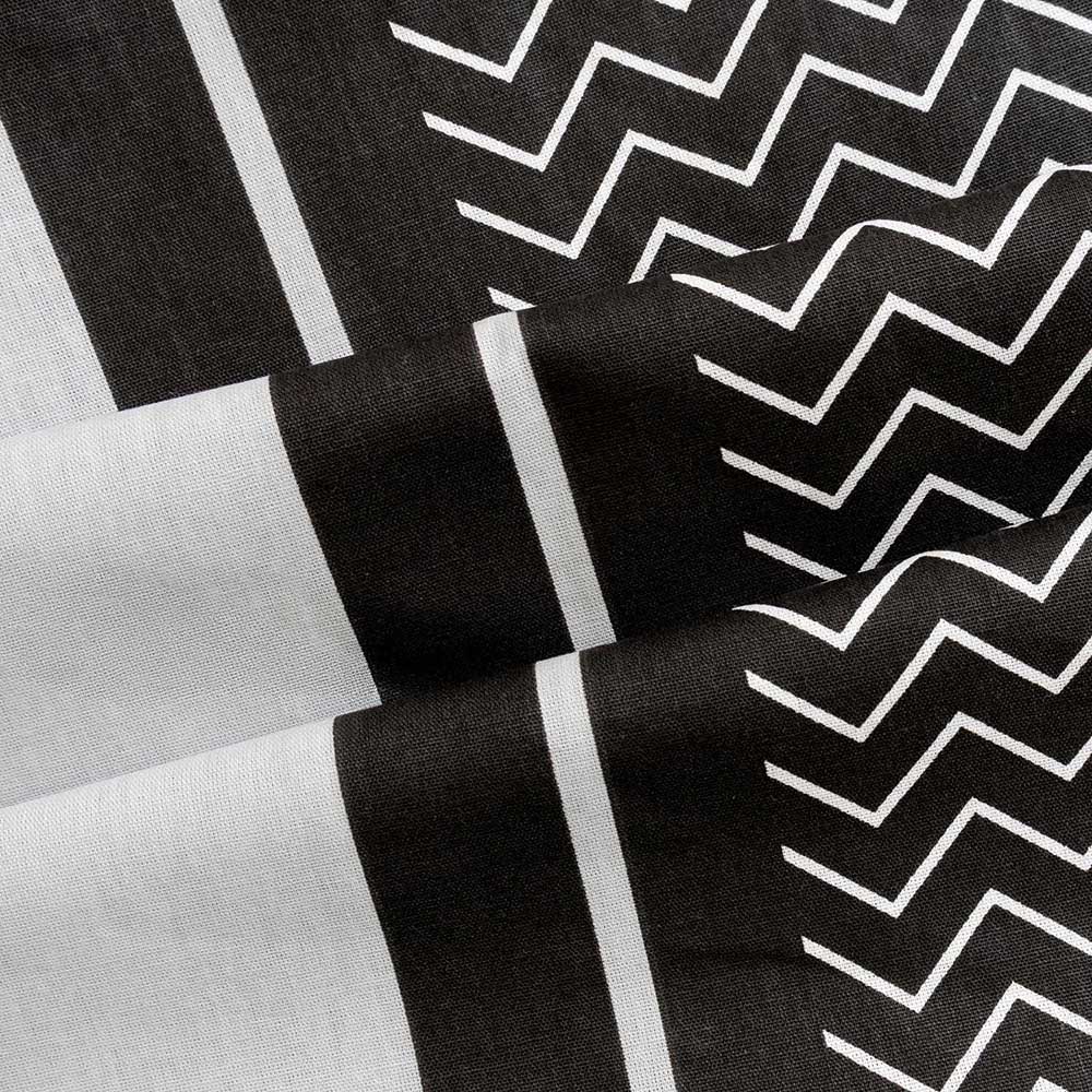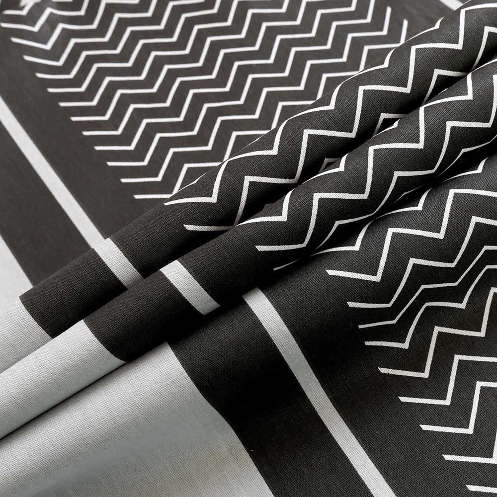 Nowoczesny wzór pasowy w kontrastowej czarno-szaro-białej kolorystyce nadaje sypialni wyrazisty i designerski charakter. Zróżnicowane faktury i rytmiczne linie tworzą dynamiczną kompozycję, która świetnie wpisuje się w trendy nowoczesnych i minimalistycznych wnętrz.