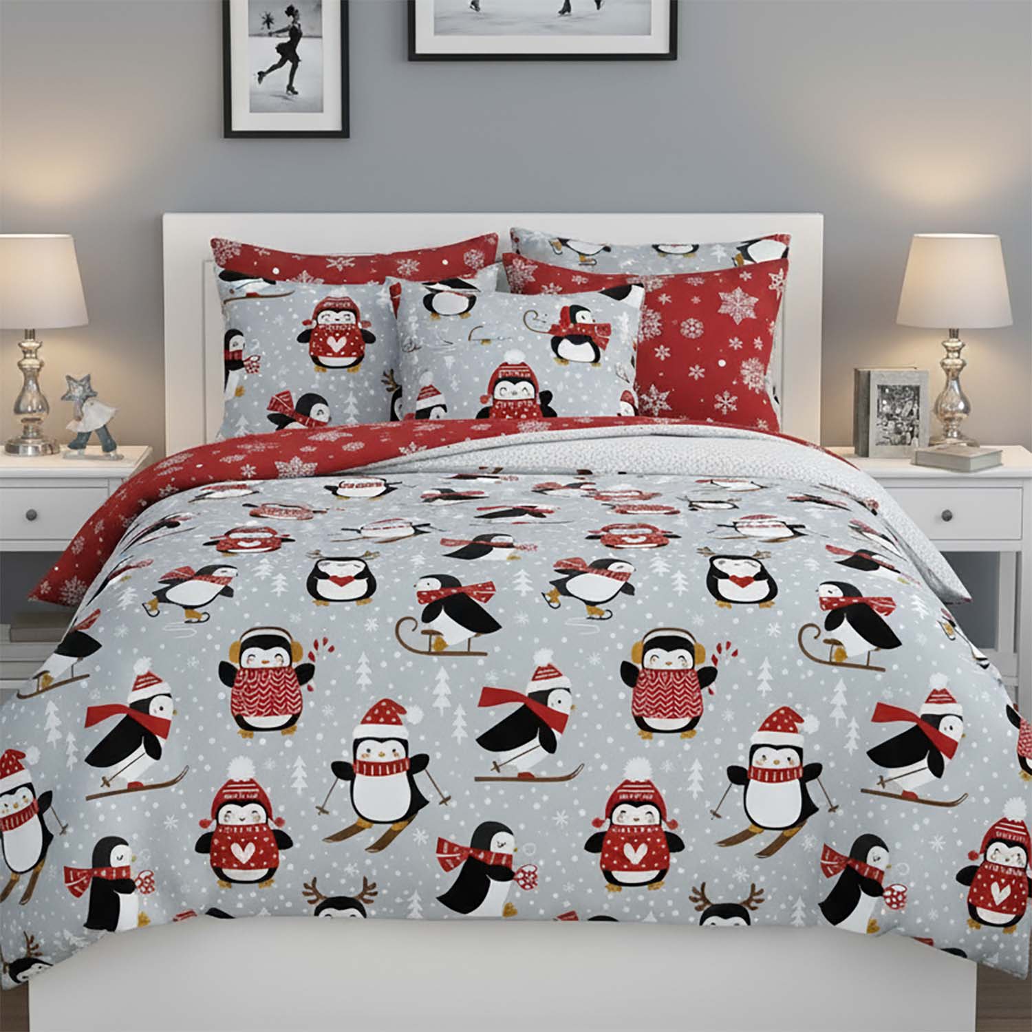 Wesoły motyw świąteczny z pingwinami w czapkach i szalikach na szarym tle wprowadza do sypialni radosny, zimowy klimat. Wzór z drobnymi śnieżynkami i uroczymi postaciami tworzy przytulną atmosferę idealną na długie, chłodne wieczory.
