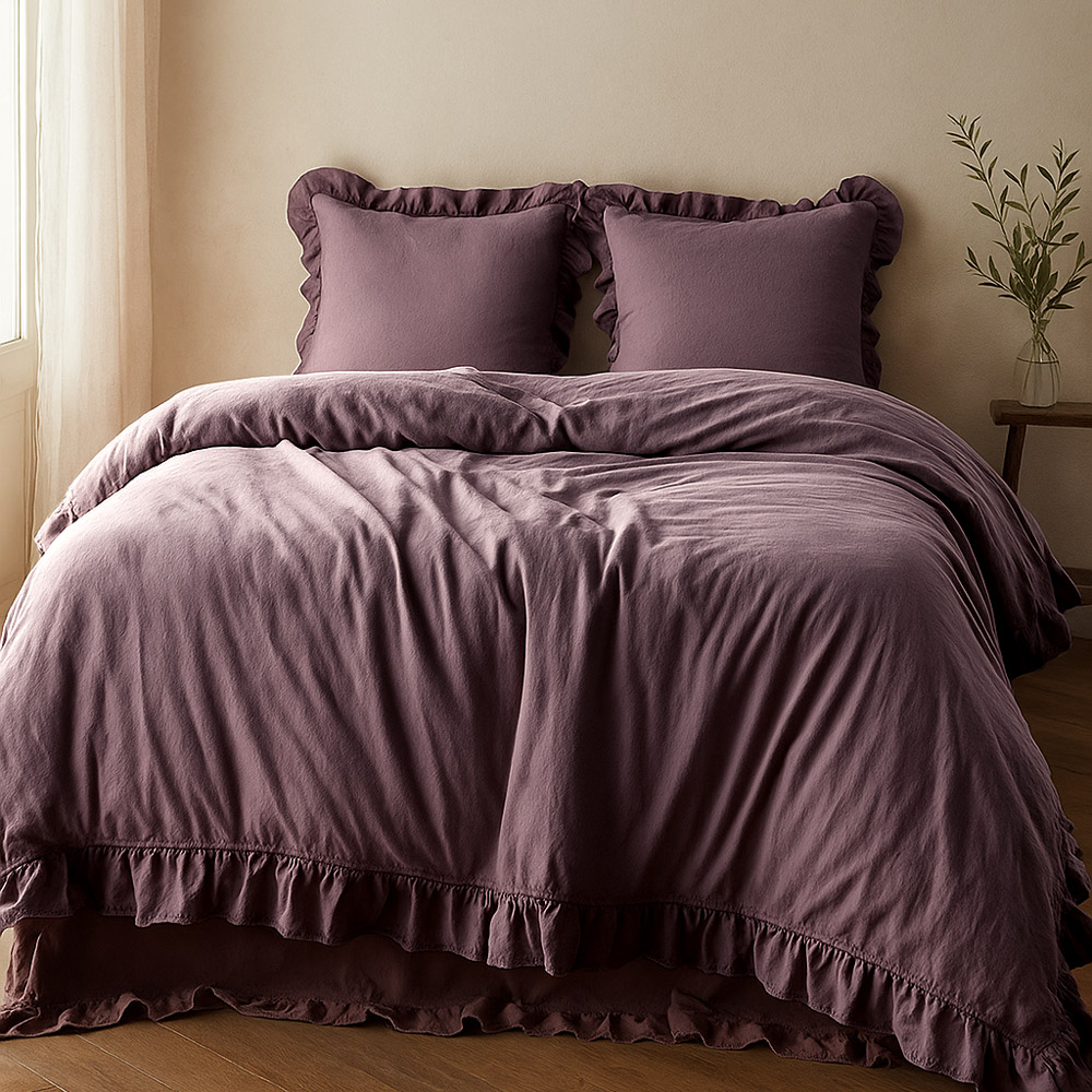 Pościel bawełniana z falbanką 160x200 Stonewashed Exclusive, Malina, fioletowa