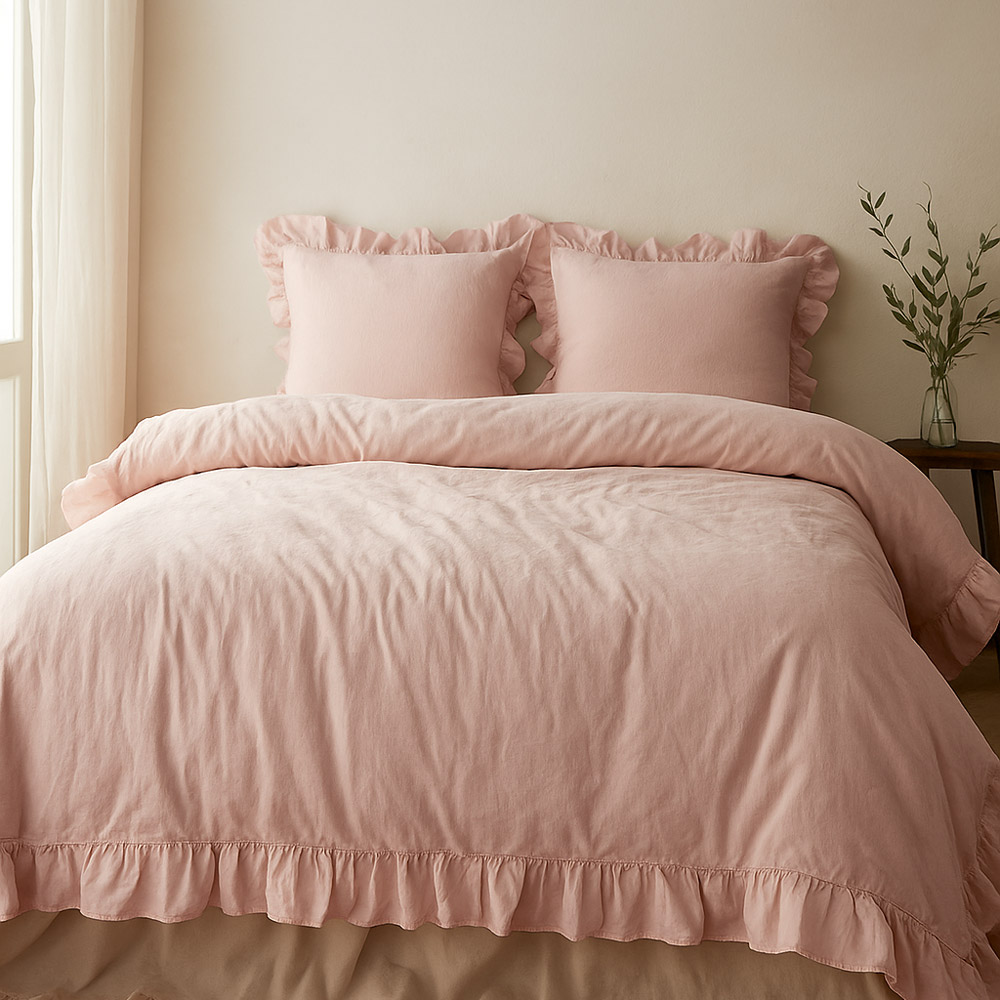 Komplet w delikatnym różowym kolorze posiada efektywną falbankę, co sprawia, że pościel stanowi idealny element aranżacyjny do sypialni dodając jej wyjątkowego wyglądu. Szczególna dbałość o detale oraz perfekcyjne wykończenie w postaci podwójnego szwu gwarantuje wysoki komfort użytkowania.