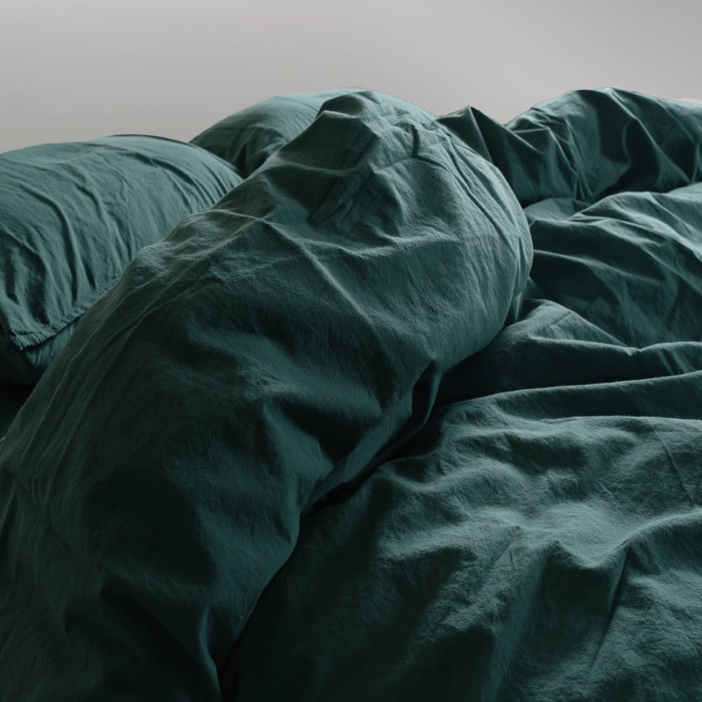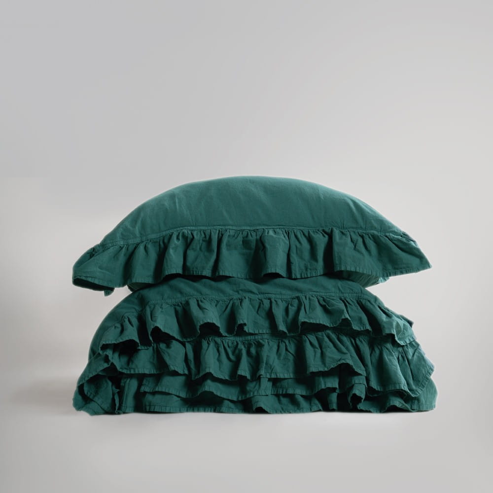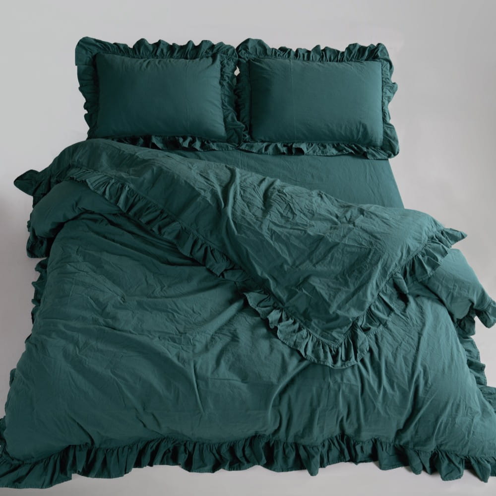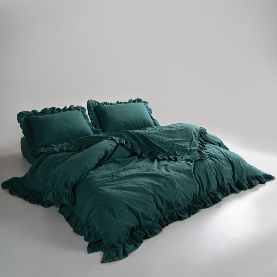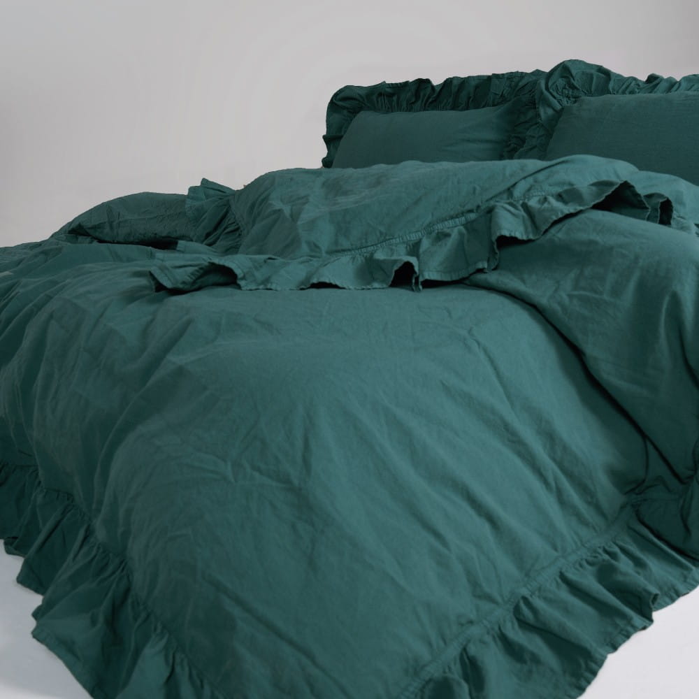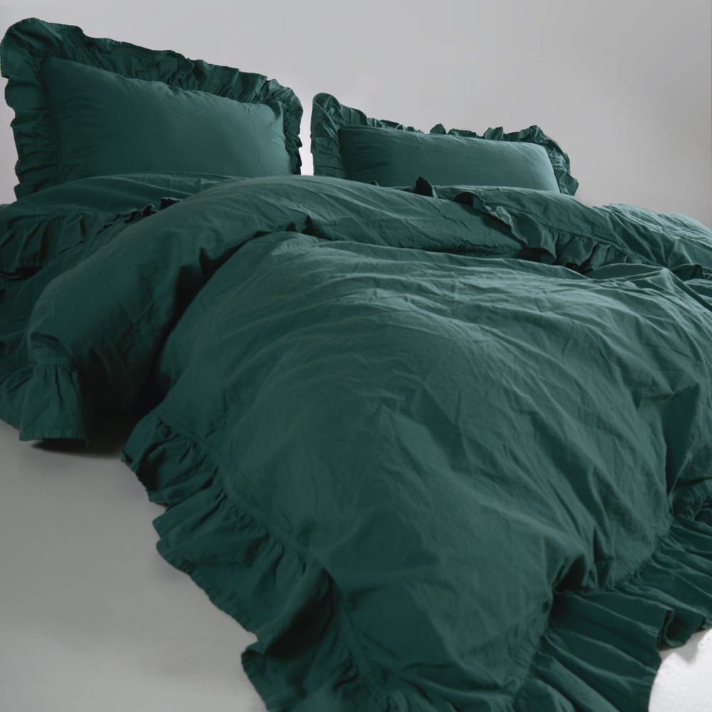 Pościel bawełniana z falbanką 160x200 Stonewashed Exclusive, Dark Green, zieleń butelkowa