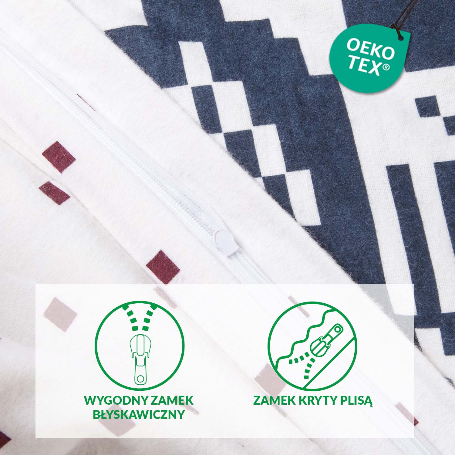 Praktyczne zapięcie na zamek błyskawiczny - zarówno poszwa 140x200 cm, jak i poszewka wyposażone są w wygodny zamek, który przykryty został delikatną plisą, co ułatwia szybką zmianę bielizny pościelowej, codzienne użytkowanie i nie podrażnia skóry.