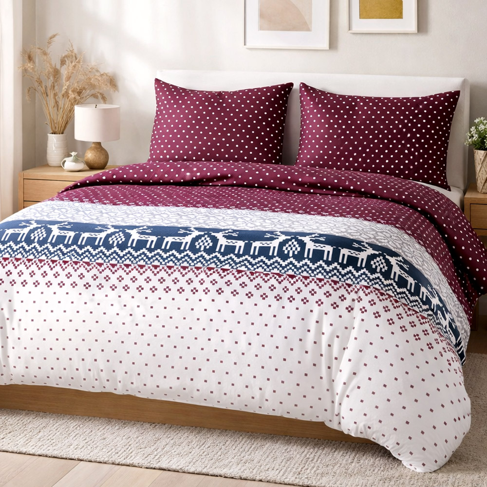 Pościel flanelowa 140x200 Arvena bordowa w renifery i kratkę, Flanelove