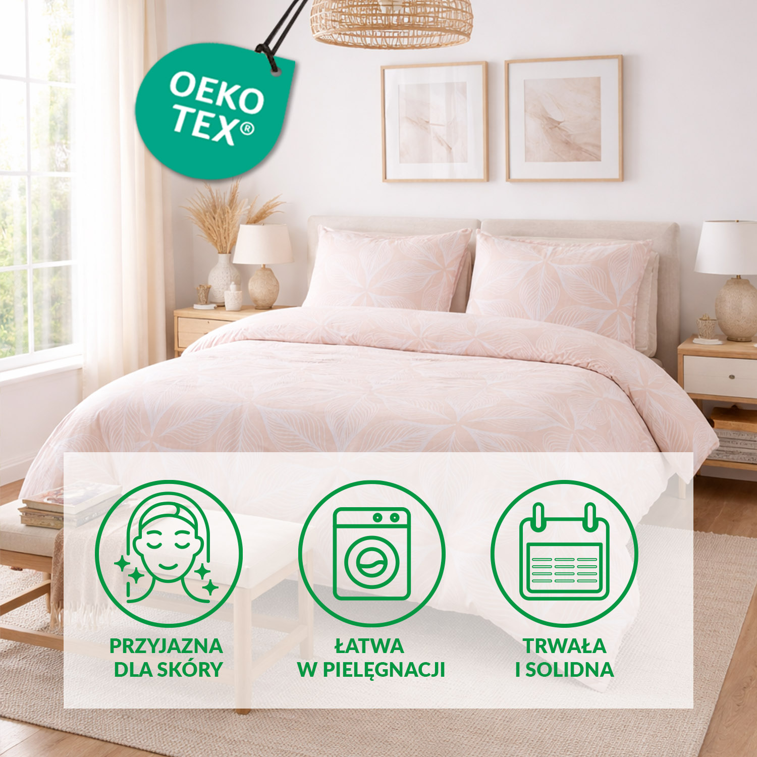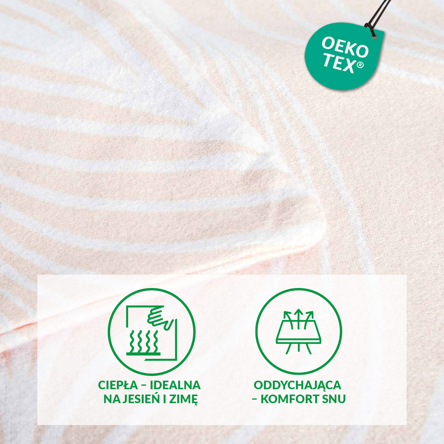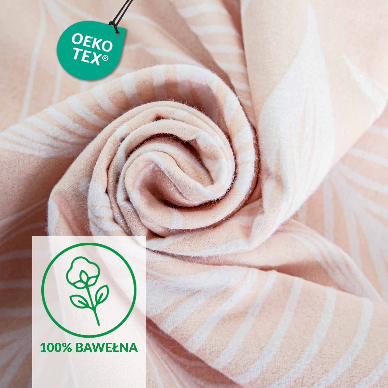 Pudrowo różowa tkanina ozdobiona białymi liśćmi nadaje sypialni elegancji i świeżości, tworząc przytulną atmosferę. Pościel z kolekcji Flanelove wyróżnia się unikalnym wzornictwem i żywą kolorystyką. Jest to doskonały wybór dla osób ceniących sobie zarówno komfort, jak i estetyczny wygląd swojej sypialni.