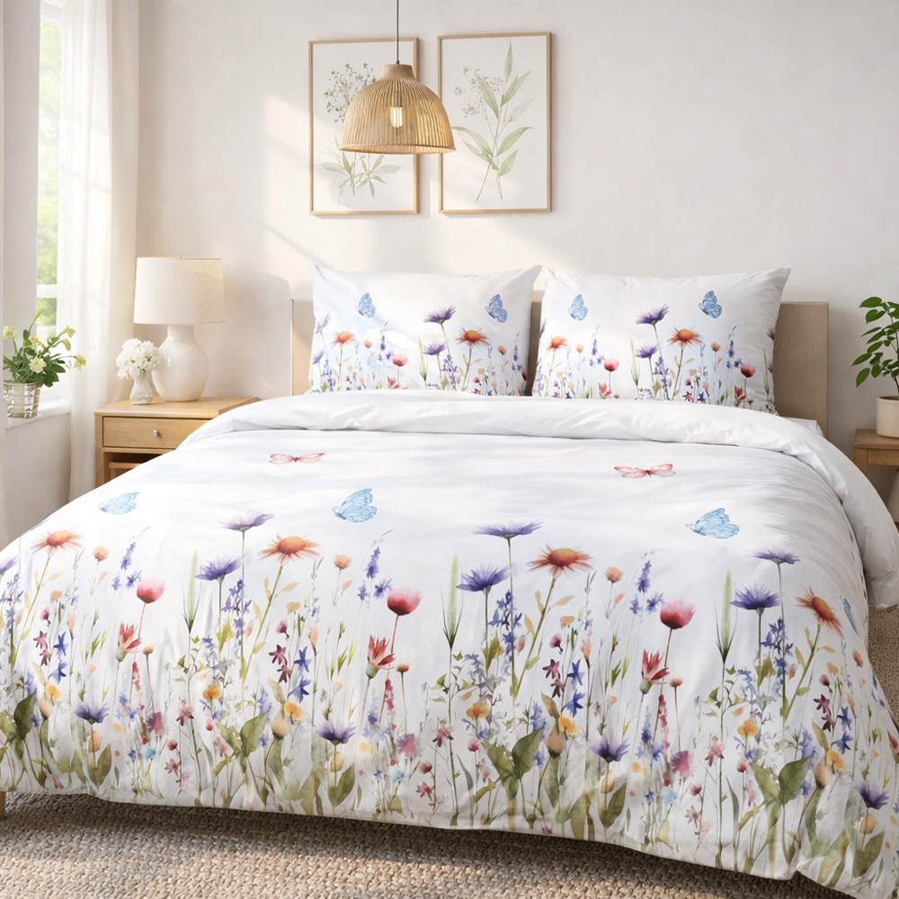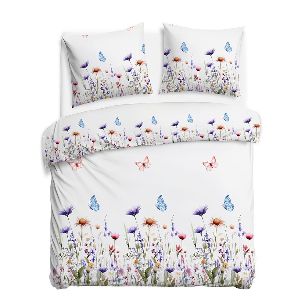 Ciepła i miękka pościel ze 100% bawełny, flanela w rozmiarze 180x200 cm w kolorową łąkę z kwiatów na białym tle