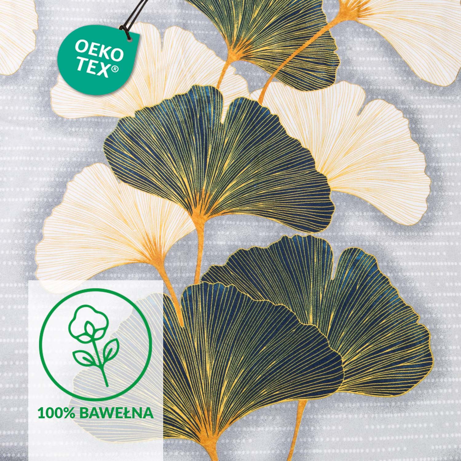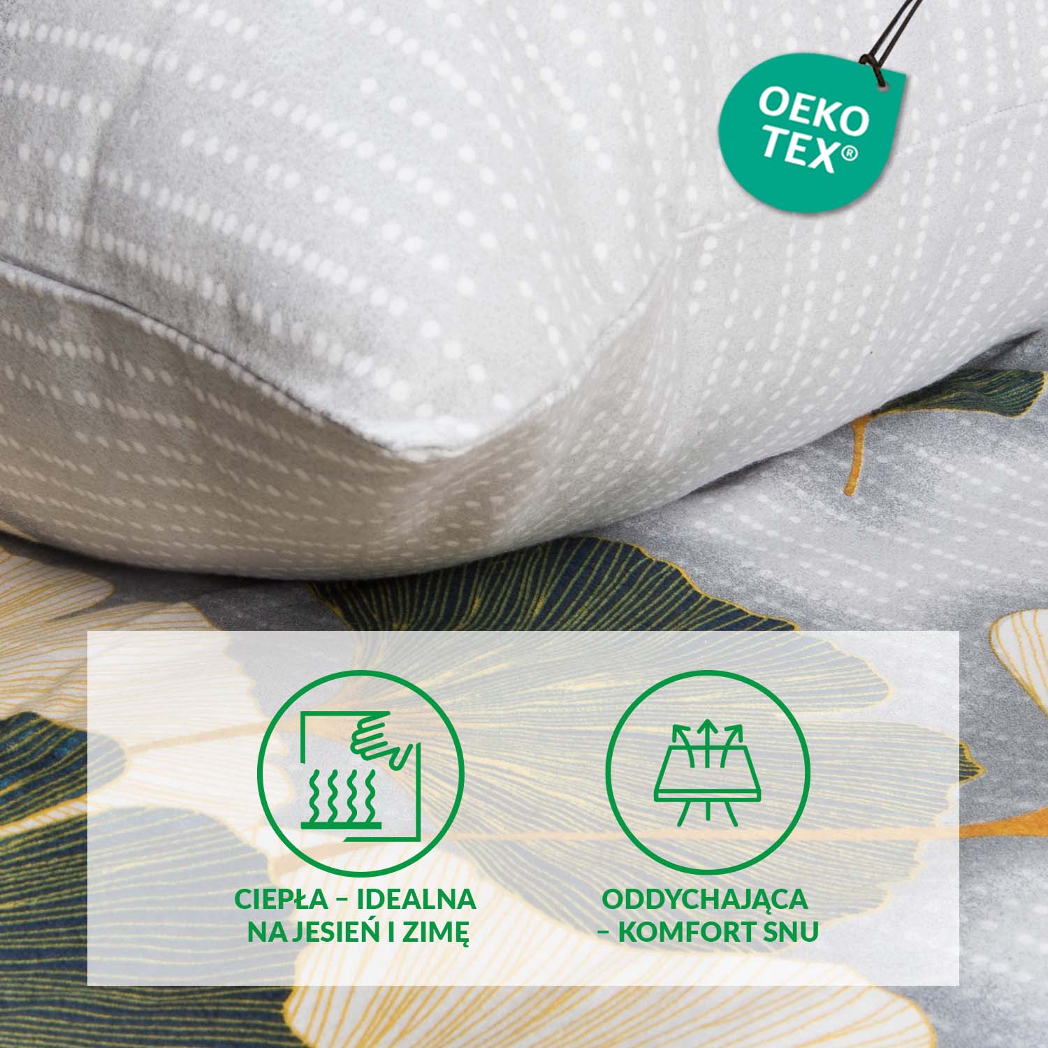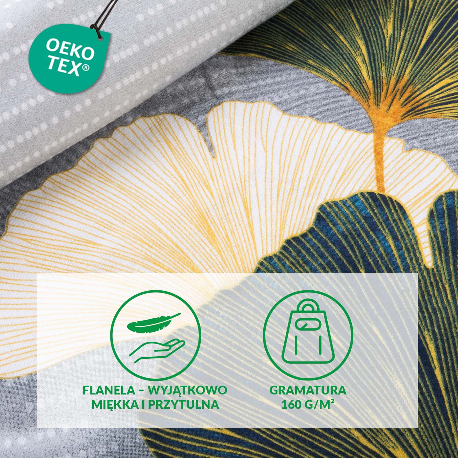 Ciepła i miękka pościel ze 100% bawełny, flanela w rozmiarze 180x200 cm w delikatne liście miłorzębu na jasnym szarym tle