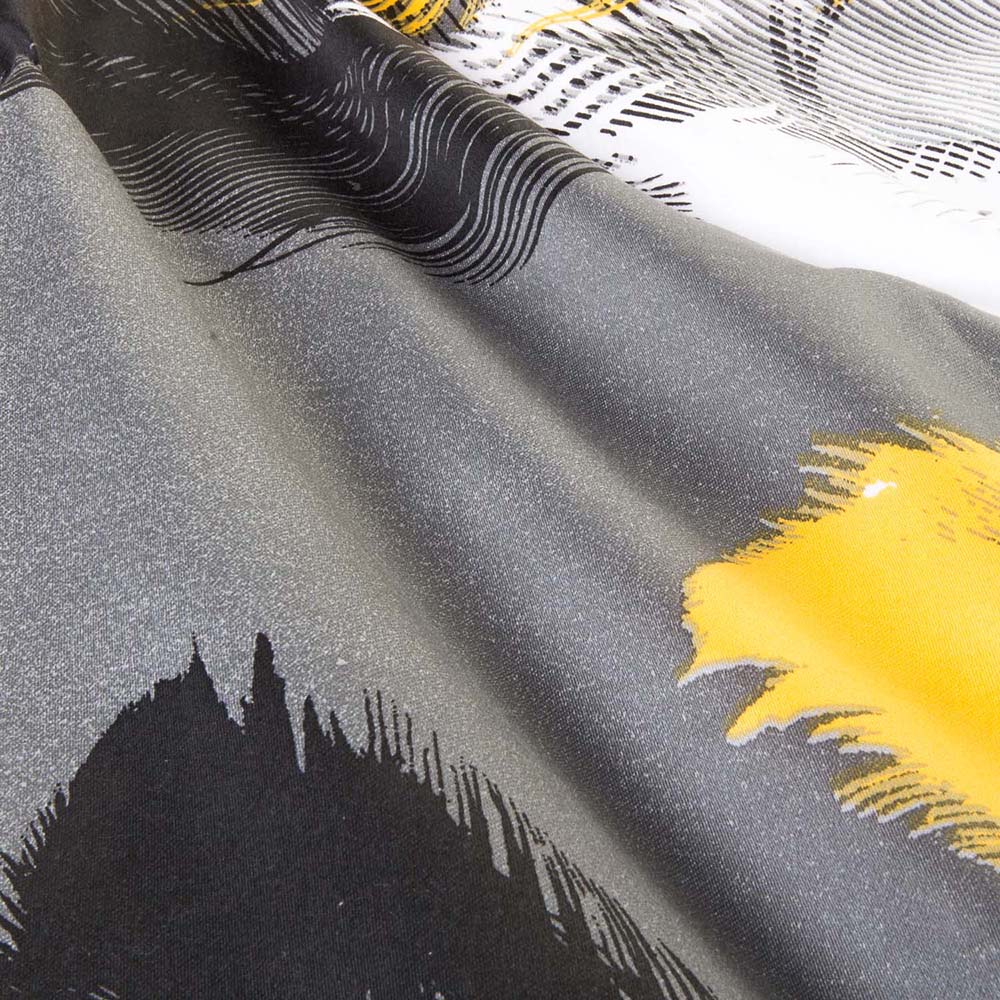 Delikatny motyw piór - pościel satynowa 140x200 cm Fevola zdobiona jest żółtymi, czarnymi i białymi piórami na szarym tle, co tworzy efekt lekkości i harmonii, a jednocześnie nadaje wnętrzu niepowtarzalny charakter.