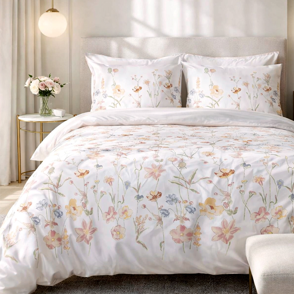 Romantyczny motyw kwiatowy - pościel satynowa 140x200 cm Floralis zdobiona pastelowymi polnymi kwiatami na białym tle wnosi do sypialni delikatny klimat.