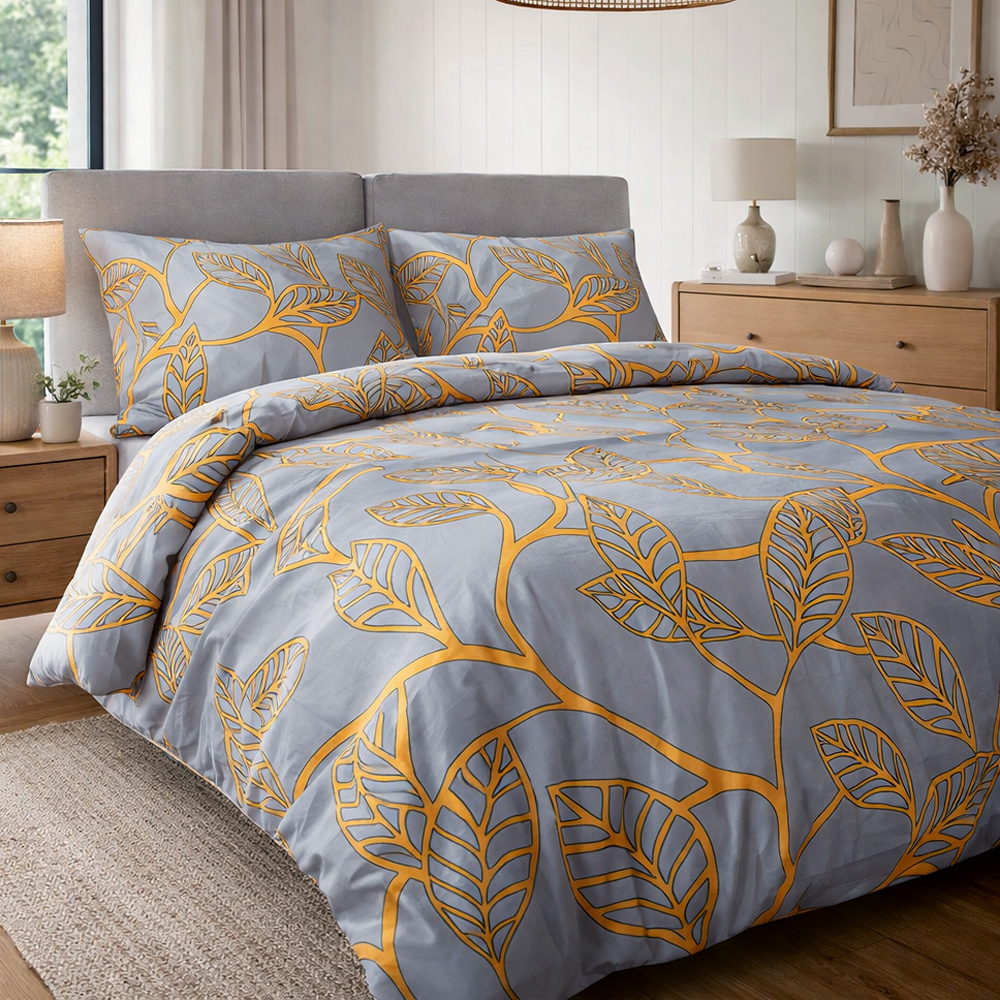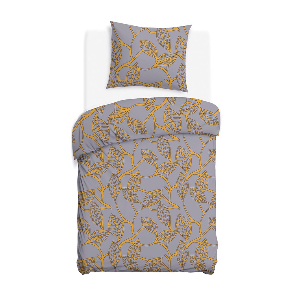 Delikatna, miękka pościel satynowa z 100% bawełny w rozmiarze 140x200 cm w piękny wzór pomarańczowych liści z szarym tłem