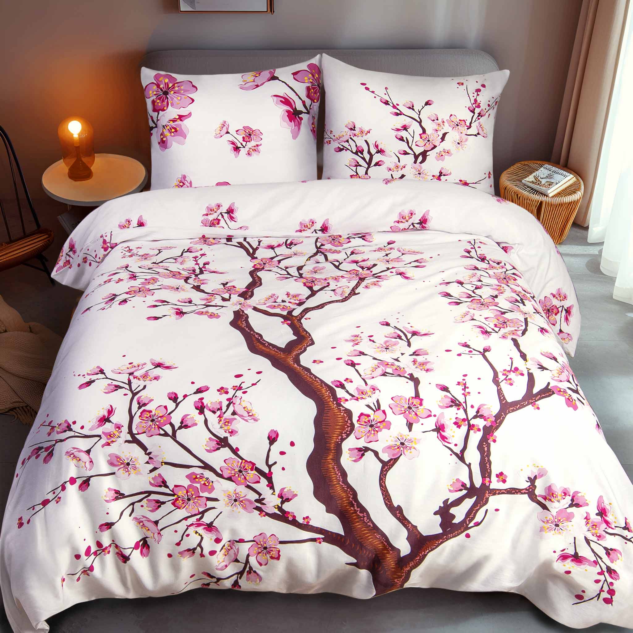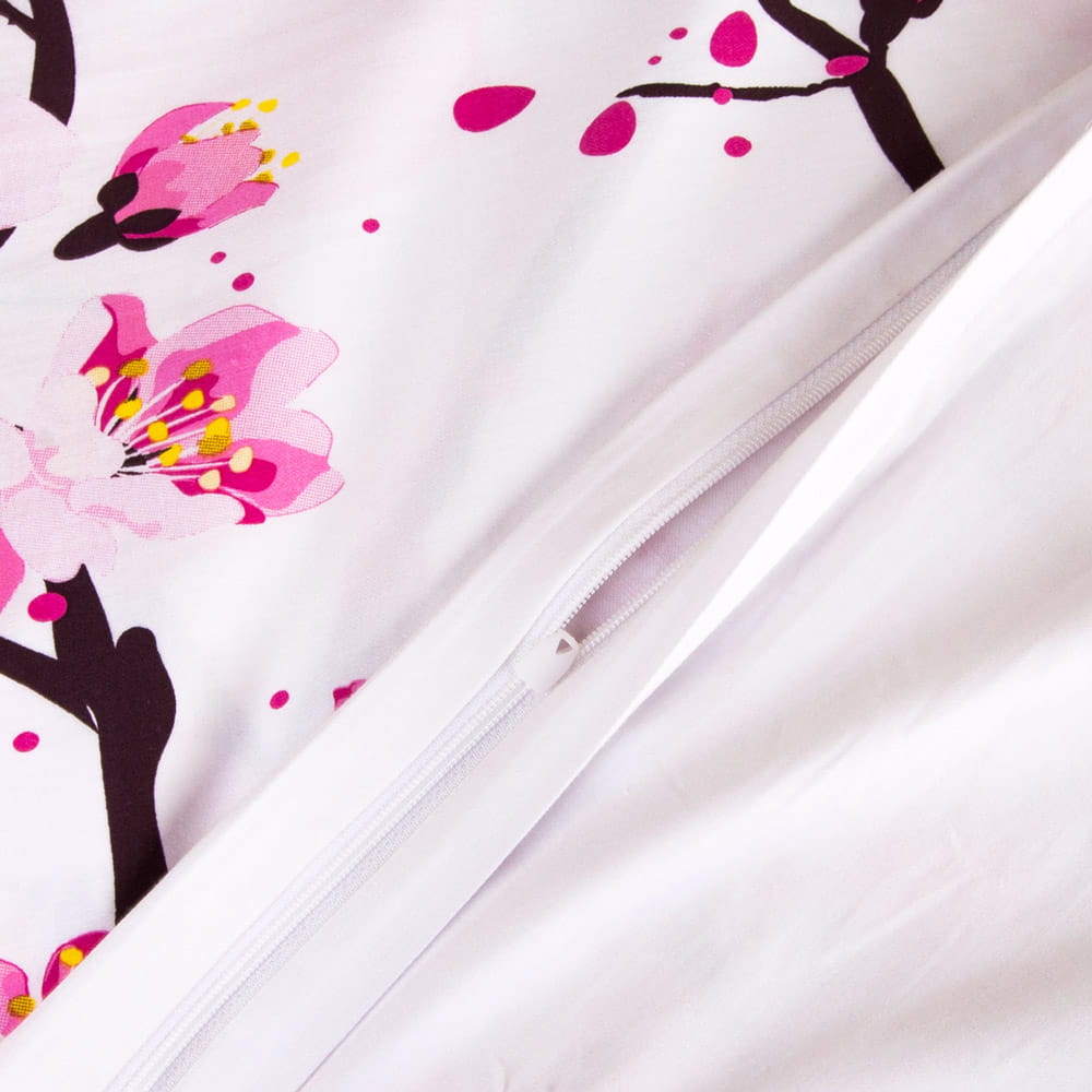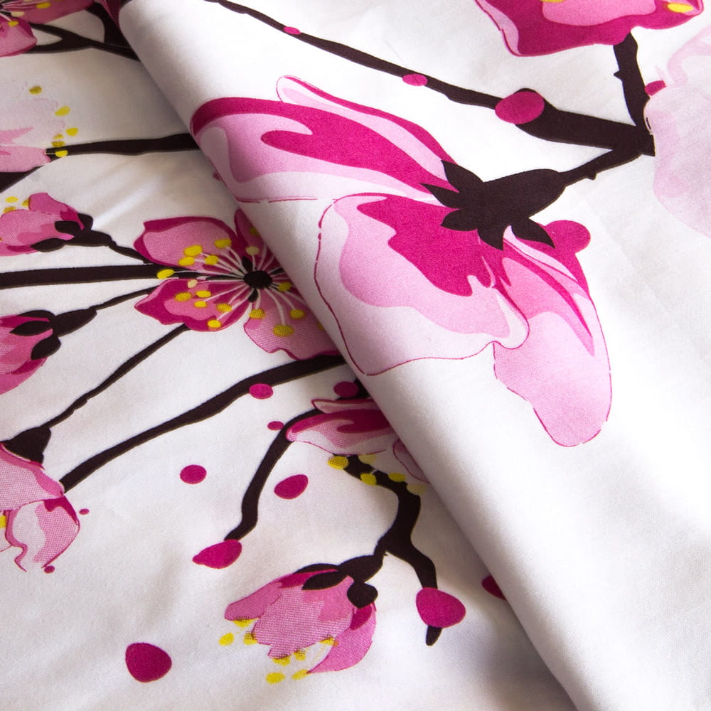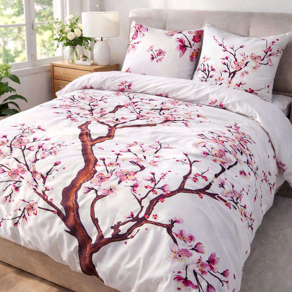 Delikatna miękka bawełniana biała pościel z drzewem wiśni z różowymi kwiatami 180x200 cm