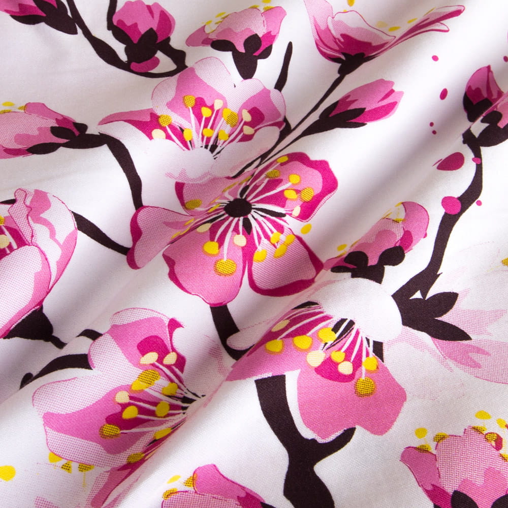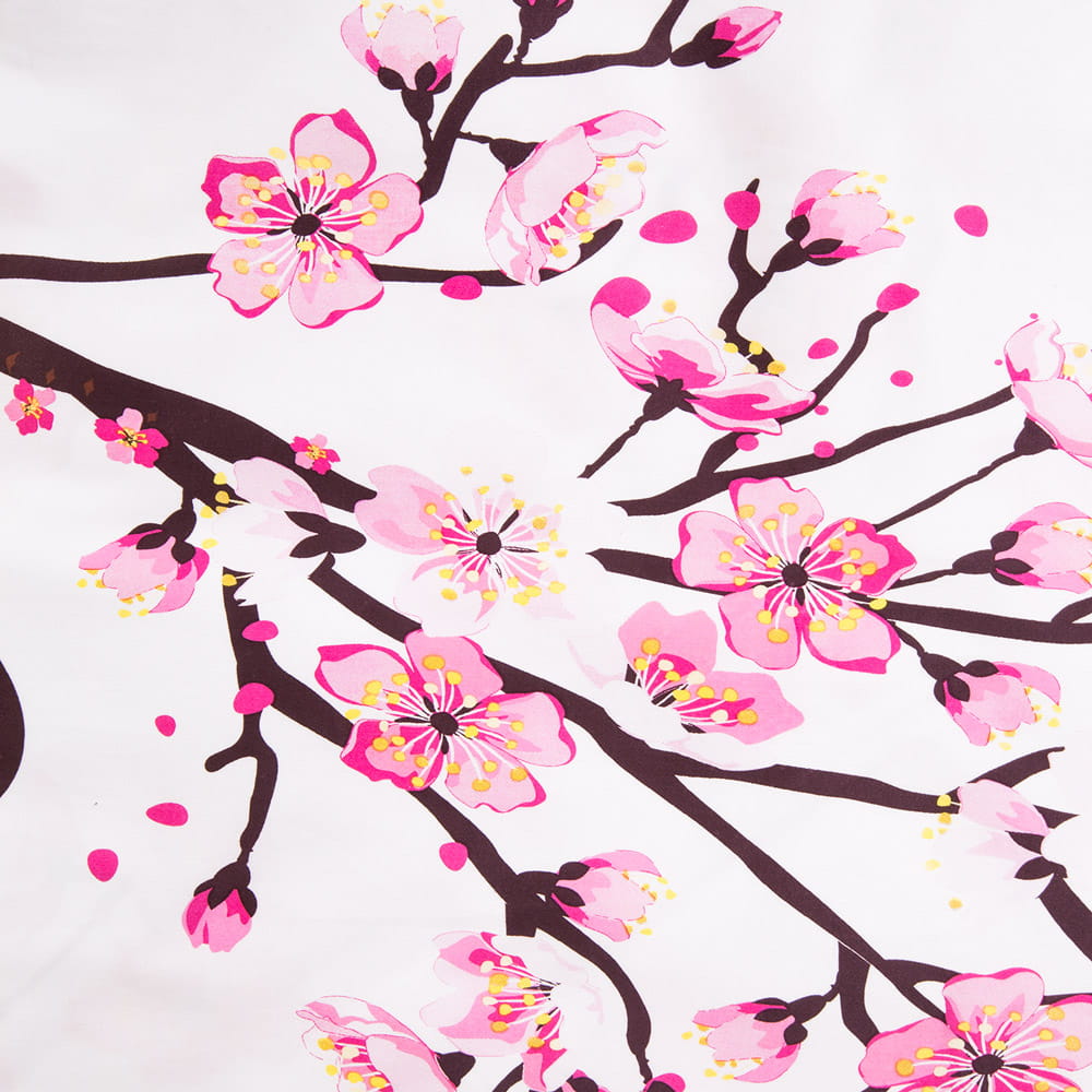 Delikatne, różowe kwiaty drzewa wiśniowego na śnieżnobiałym tle tworzą wzór pełen gracji i spokoju, inspirowany pięknem japońskich ogrodów. Idealnie pasuje do wnętrz urządzonych w stylu klasycznym, minimalistycznym, jak i romantycznym.