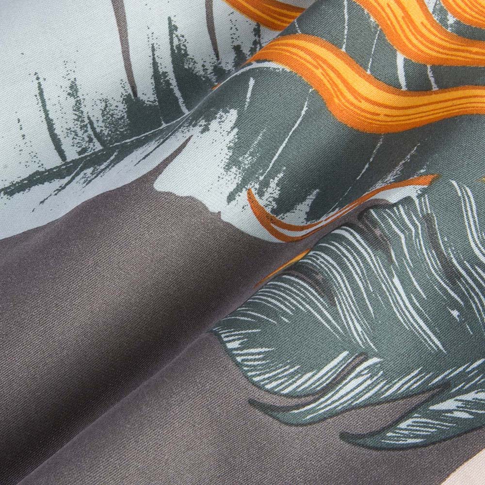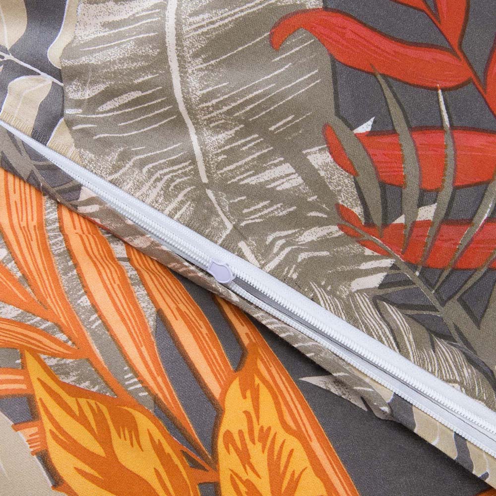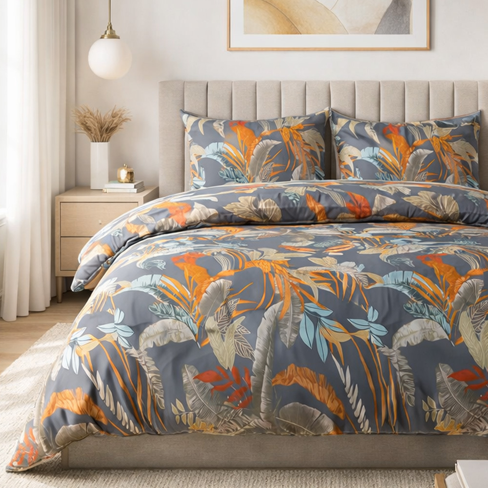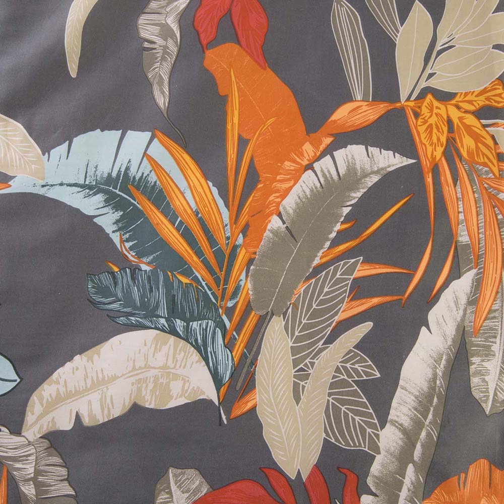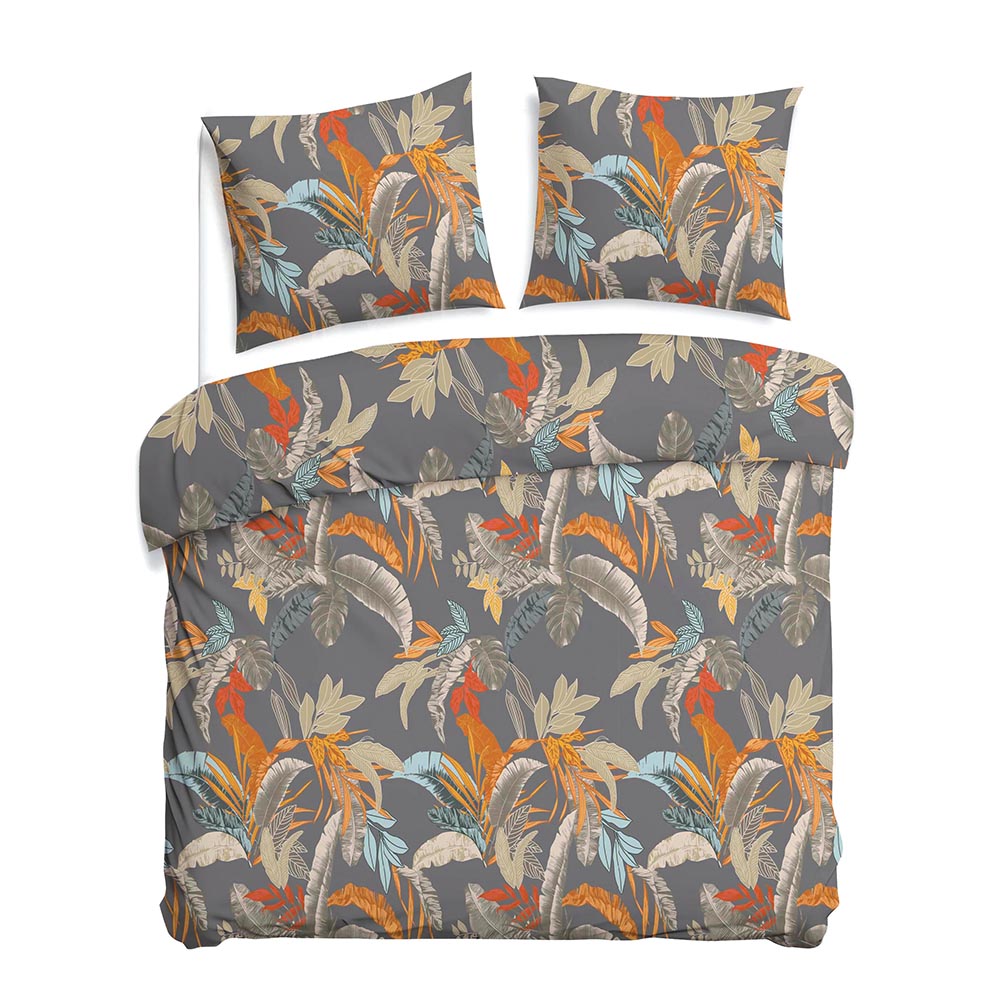 Egzotyczny wzór tropikalny - pościel satynowa 180x200 cm Tropenza zachwyca intensywnymi liśćmi w odcieniach pomarańczu, błękitu i czerwieni na szarym tle, wprowadzając do sypialni nowoczesny styl.