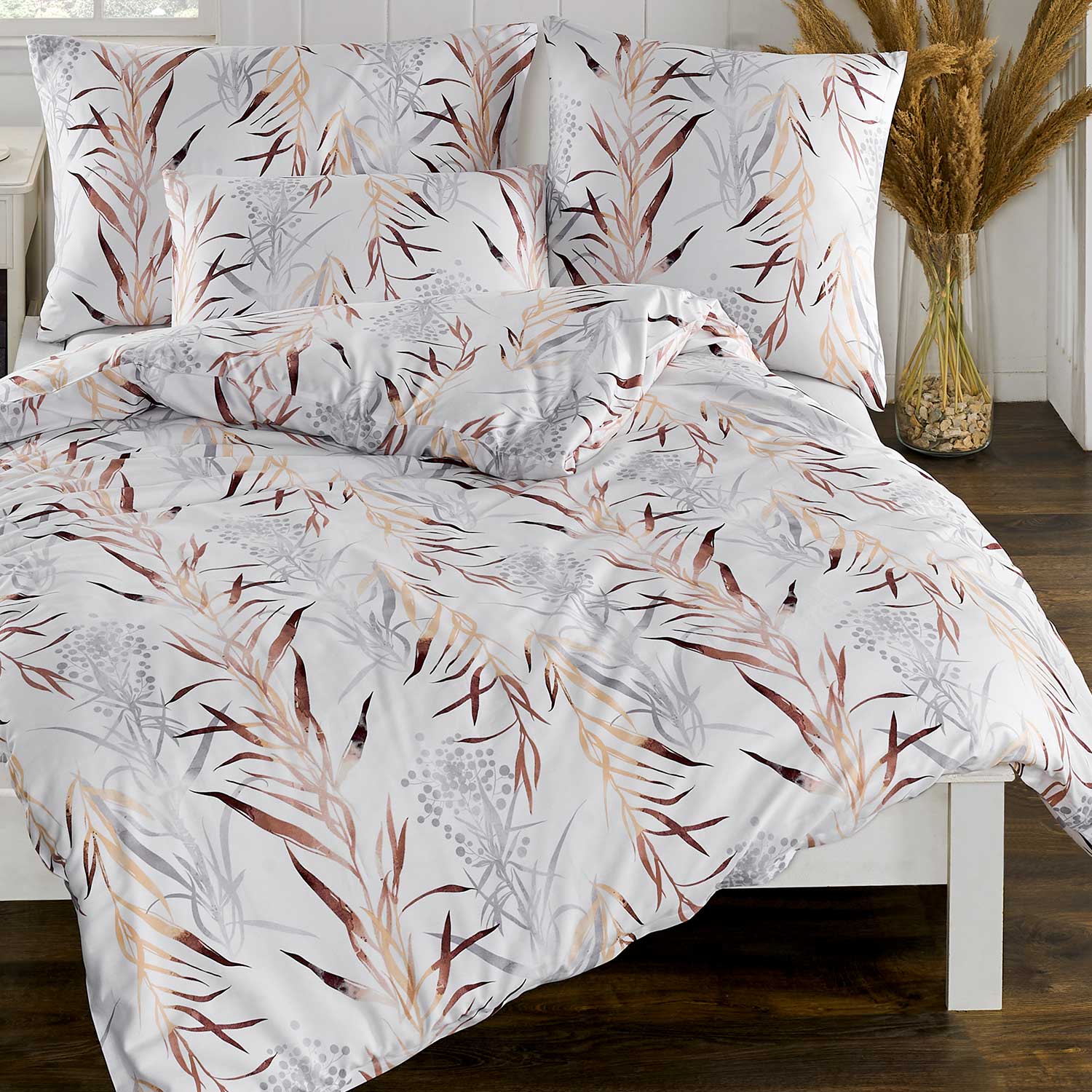 Pościel z Kolekcji Exclusive to nie tylko gwarancja luksusu i wygody, ale również piękny element dekoracyjny. Wzór z szaro-beżowymi liśćmi wprowadza do sypialni ciepło i naturalną harmonię, tworząc idealne warunki do relaksu i odpoczynku.