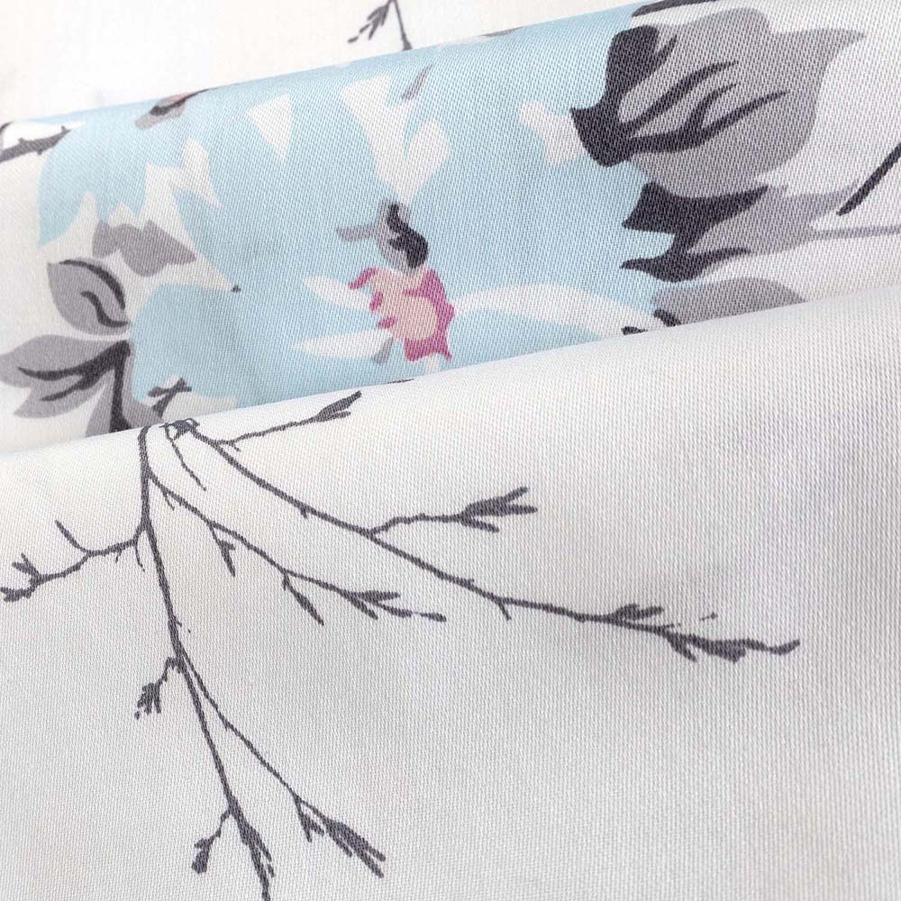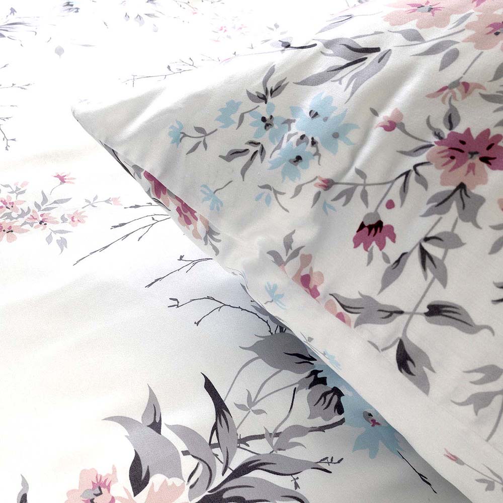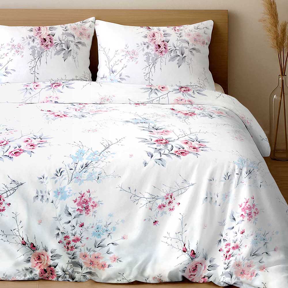 Piękna i delikatna pościel satynowa w dekoracyjne różowe i niebieskie kwiaty na białym tle w rozmiarze 200x220 cm