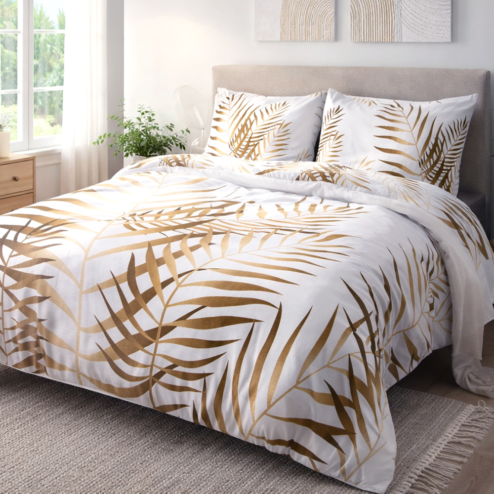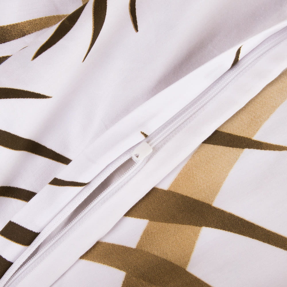 Delikatny motyw beżowych liści na białym tle wprowadza do wnętrza odrobinę natury w eleganckiej, nowoczesnej formie. Pościel doskonale komponuje się z minimalistycznymi, jak i bardziej klasycznymi aranżacjami, dodając im subtelnego uroku.