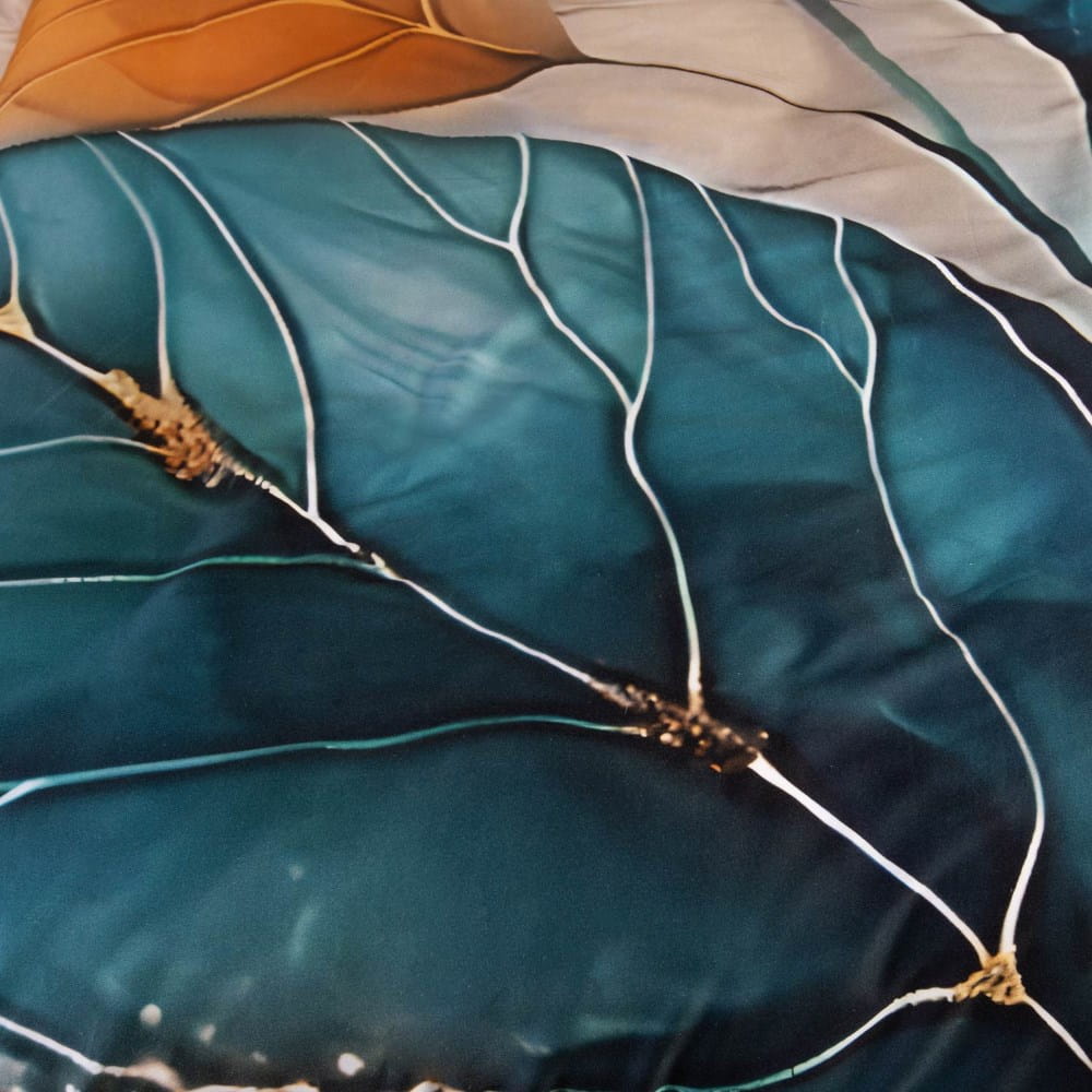Pościel satynowa 220x200 z dużym wzorem liści w odcieniach turkusu, złota i granatu w nowoczesnym stylu