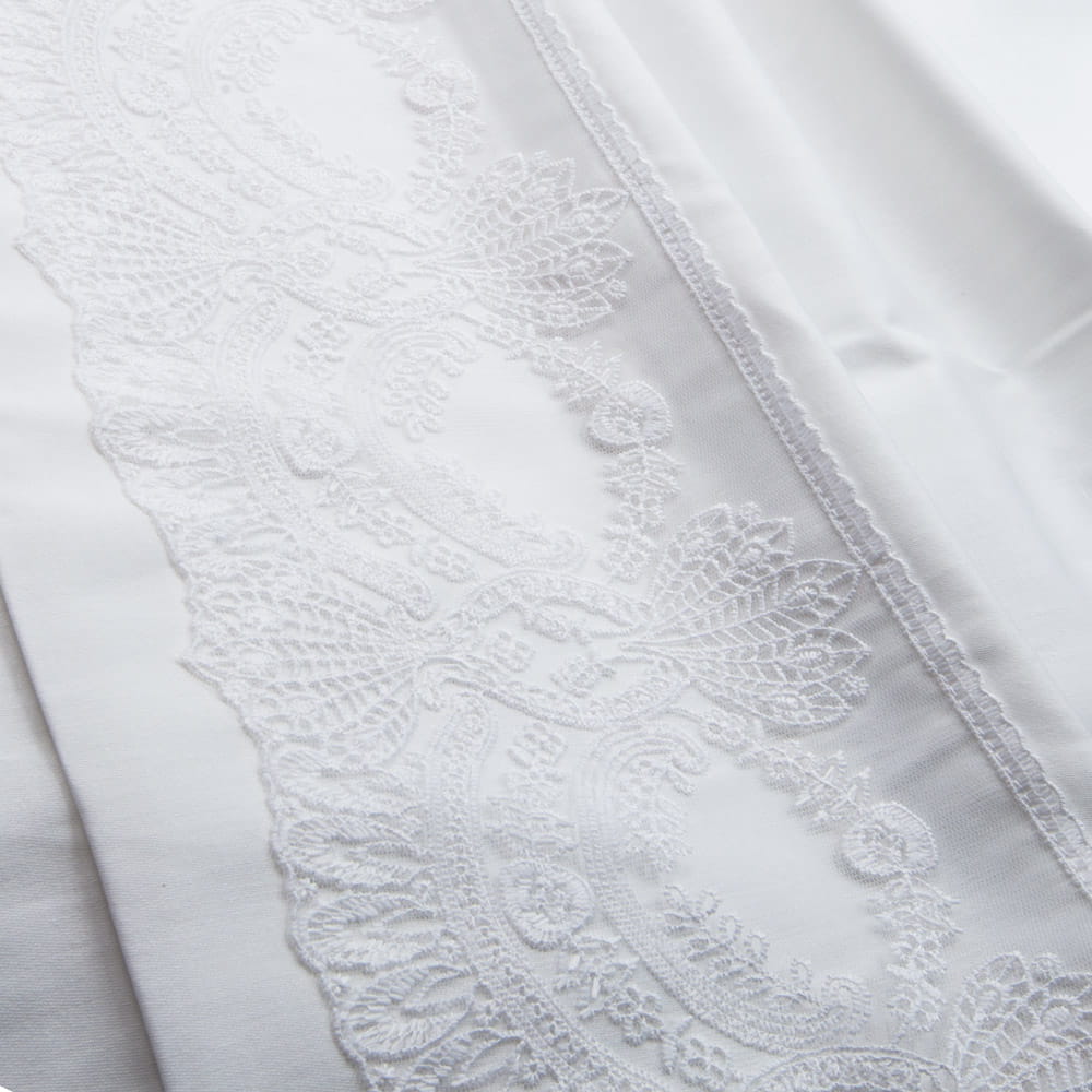 Cały komplet w kolorze białym został udekorowany subtelną gipiurą, która nadaje charakteru pościeli. Dzięki temu Twoja pościel będzie pełnić również funkcję dekoracyjną sypialni i doda jej delikatnego charakteru.