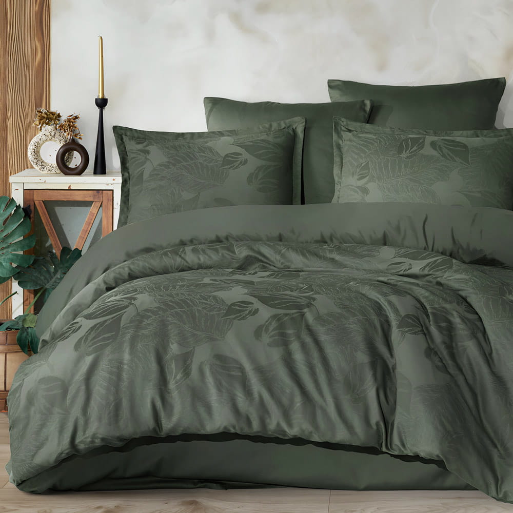 Pościel jest tkana zaawansowaną techniką żakardową z przędzy NE 40/1 o gęstości 200TC, co pozwala tworzyć na materiale wielowymiarowe wzory o delikatnym, jedwabistym połysku. Motyw liści na tle w odcieniu butelkowej zieleni dodaje subtelnej elegancji i wprowadza do sypialni nutę natury. Gruba, mocna tkanina nie tylko zachwyca wyglądem, ale również doskonale reguluje temperaturę, utrzymując ciepło i odpowiednią wentylację w nocy.