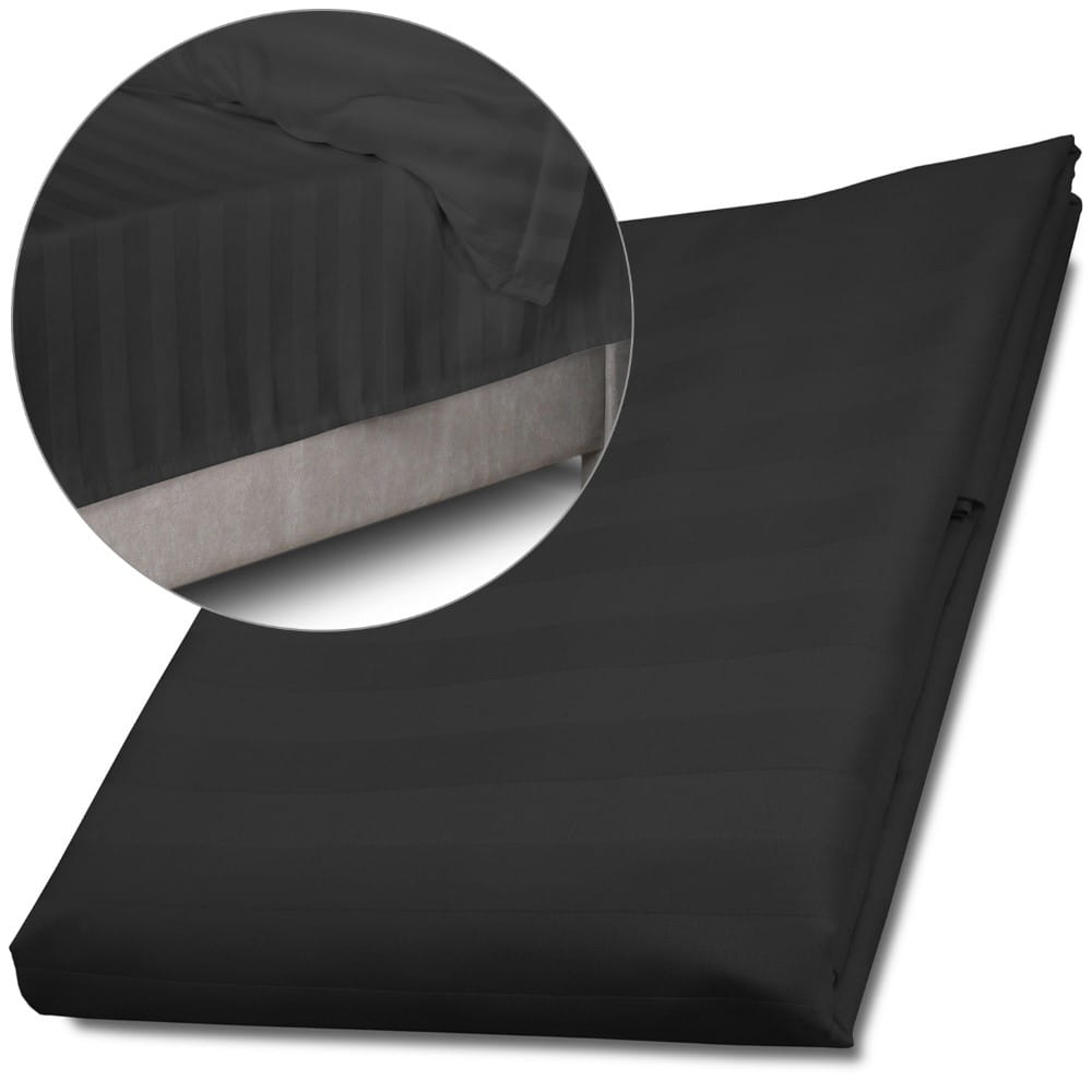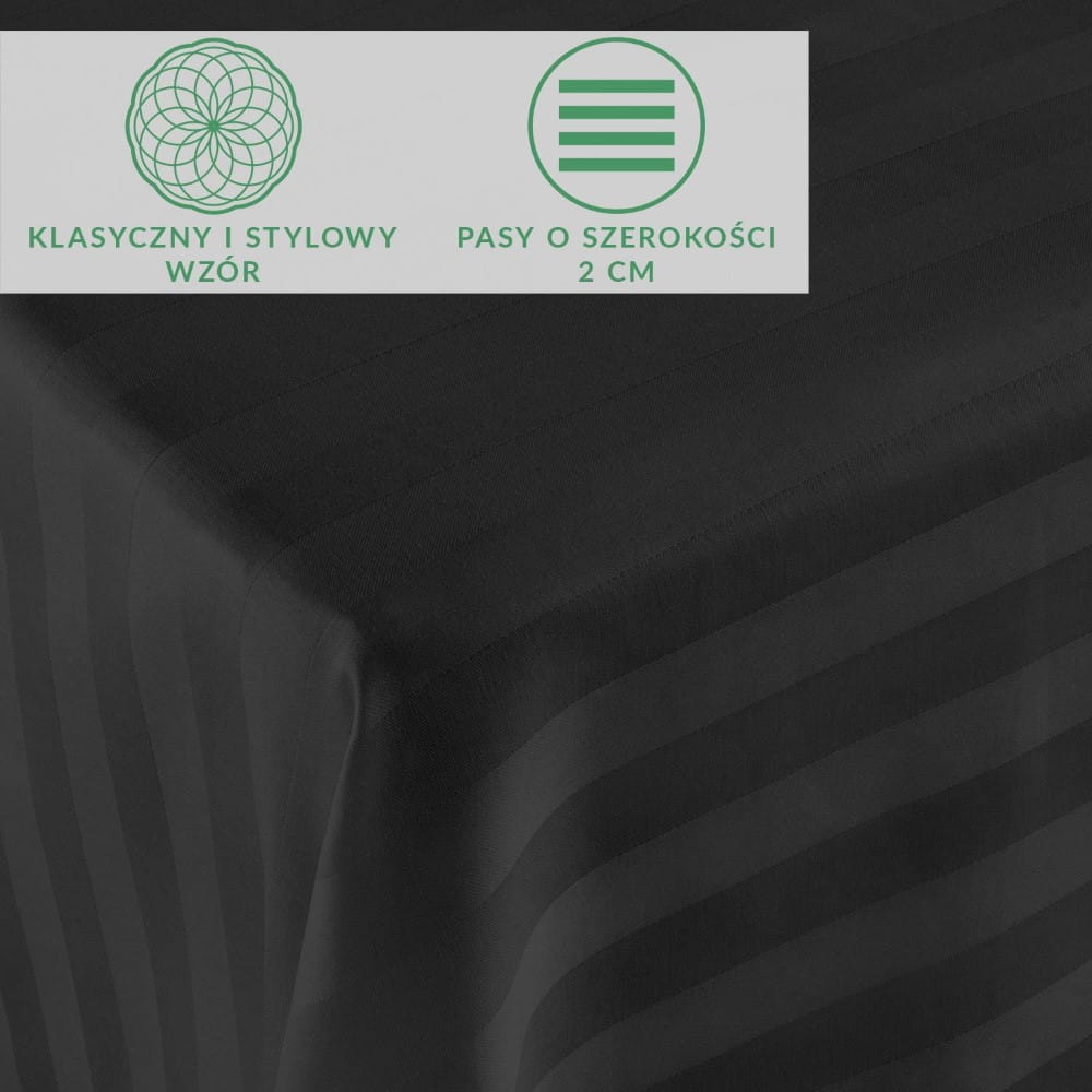 Prześcieradło 160x240 cm w pięknym czarnym kolorze posiada klasyczny i stylowy wzór w pasy o szerokości 2 cm, dodające mu wyjątkowej elegancji. Całość została starannie uszyta, co sprawia, że wniesie do Twojej sypialni nutę luksusu.