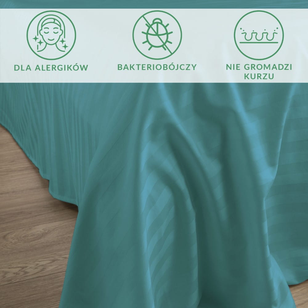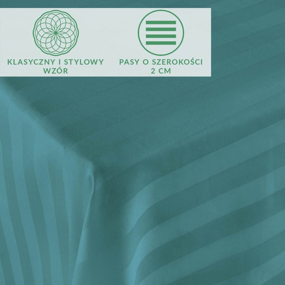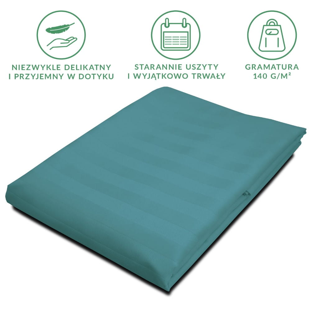 Prześcieradło 160x240 cm w pięknym turkusowym kolorze posiada klasyczny i stylowy wzór w pasy o szerokości 2 cm, dodające mu wyjątkowej elegancji. Całość została starannie uszyta, co sprawia, że wniesie do Twojej sypialni nutę luksusu.